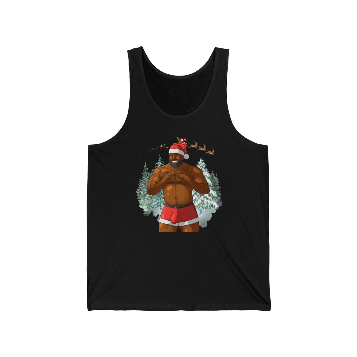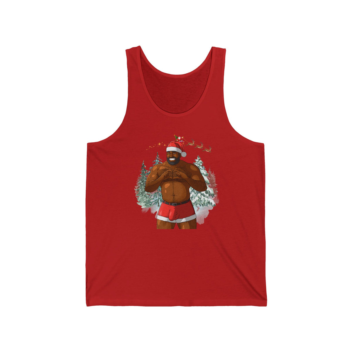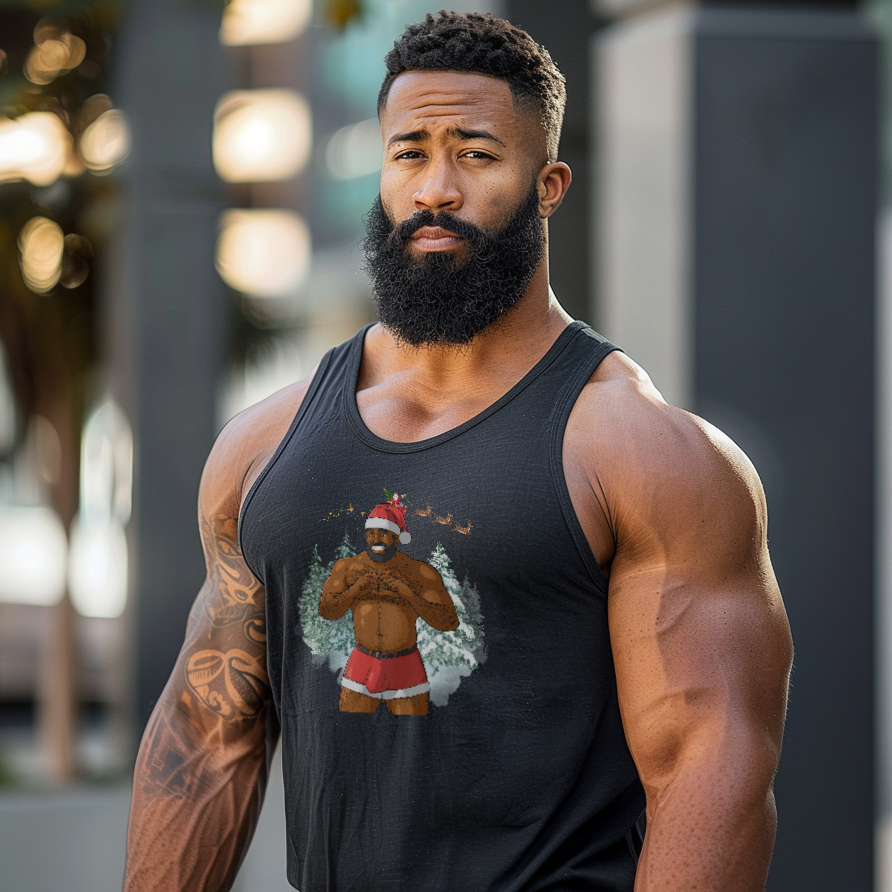 Unveil the holiday spirit with our daring and playful Big Dick (I mean Nick) Energy Tank, Black Edition, featuring a charismatic twist on Santa himself. This sexy shirtless muscle bear Santa knows you've been a little naughty, so he's arrived in his iconic red and white velveteen shorts, carrying a generous package just waiting to be unwrapped. Are you ready for the surprise? Whether you're catching eyes at a festive gathering or infusing a hint of playful charm into your winter attire, this tank top is bound to leave a lasting mark. Its comfortable fit and soft fabric make it a cozy choice for celebrating the season in style.