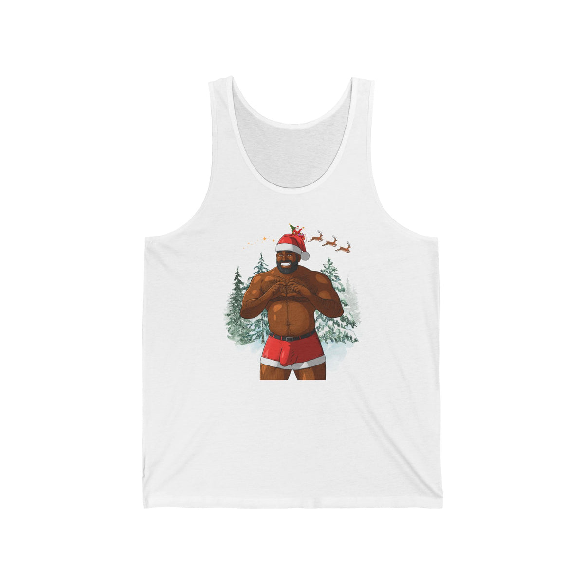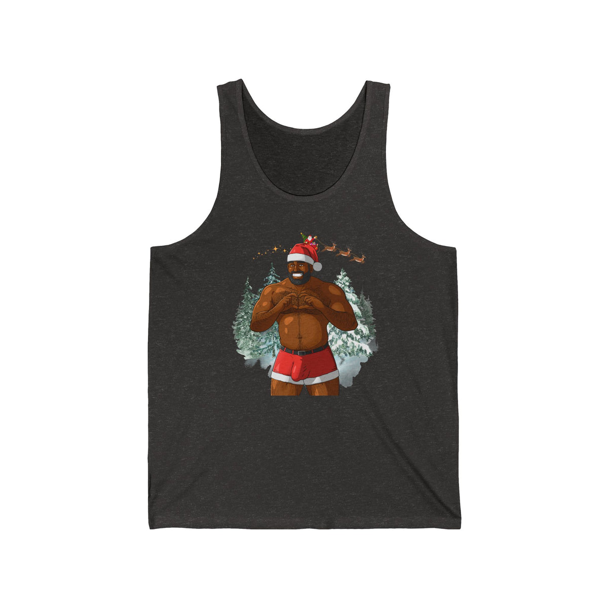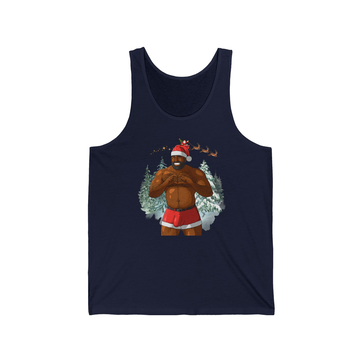 Unveil the holiday spirit with our daring and playful Big Dick (I mean Nick) Energy Tank, Black Edition, featuring a charismatic twist on Santa himself. This sexy shirtless muscle bear Santa knows you've been a little naughty, so he's arrived in his iconic red and white velveteen shorts, carrying a generous package just waiting to be unwrapped. Are you ready for the surprise? Whether you're catching eyes at a festive gathering or infusing a hint of playful charm into your winter attire, this tank top is bound to leave a lasting mark. Its comfortable fit and soft fabric make it a cozy choice for celebrating the season in style.