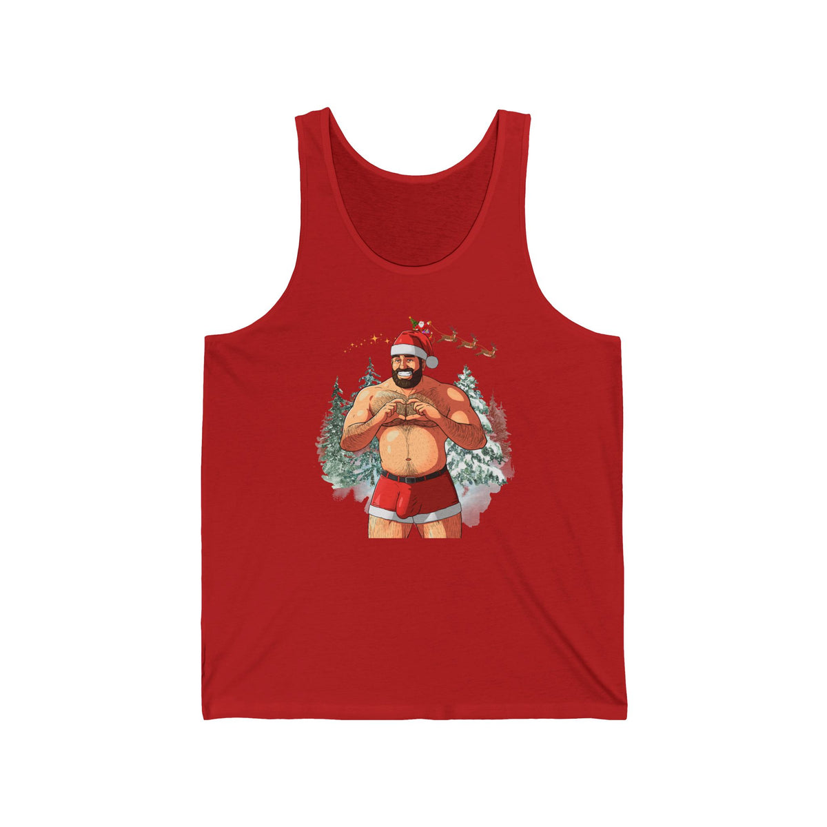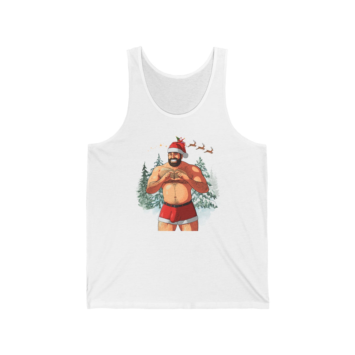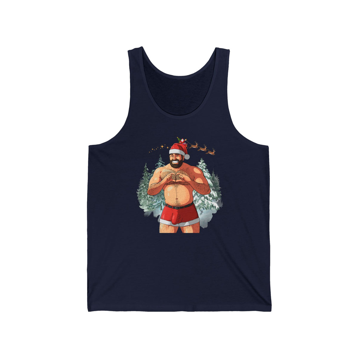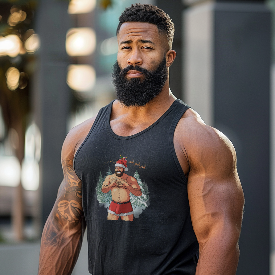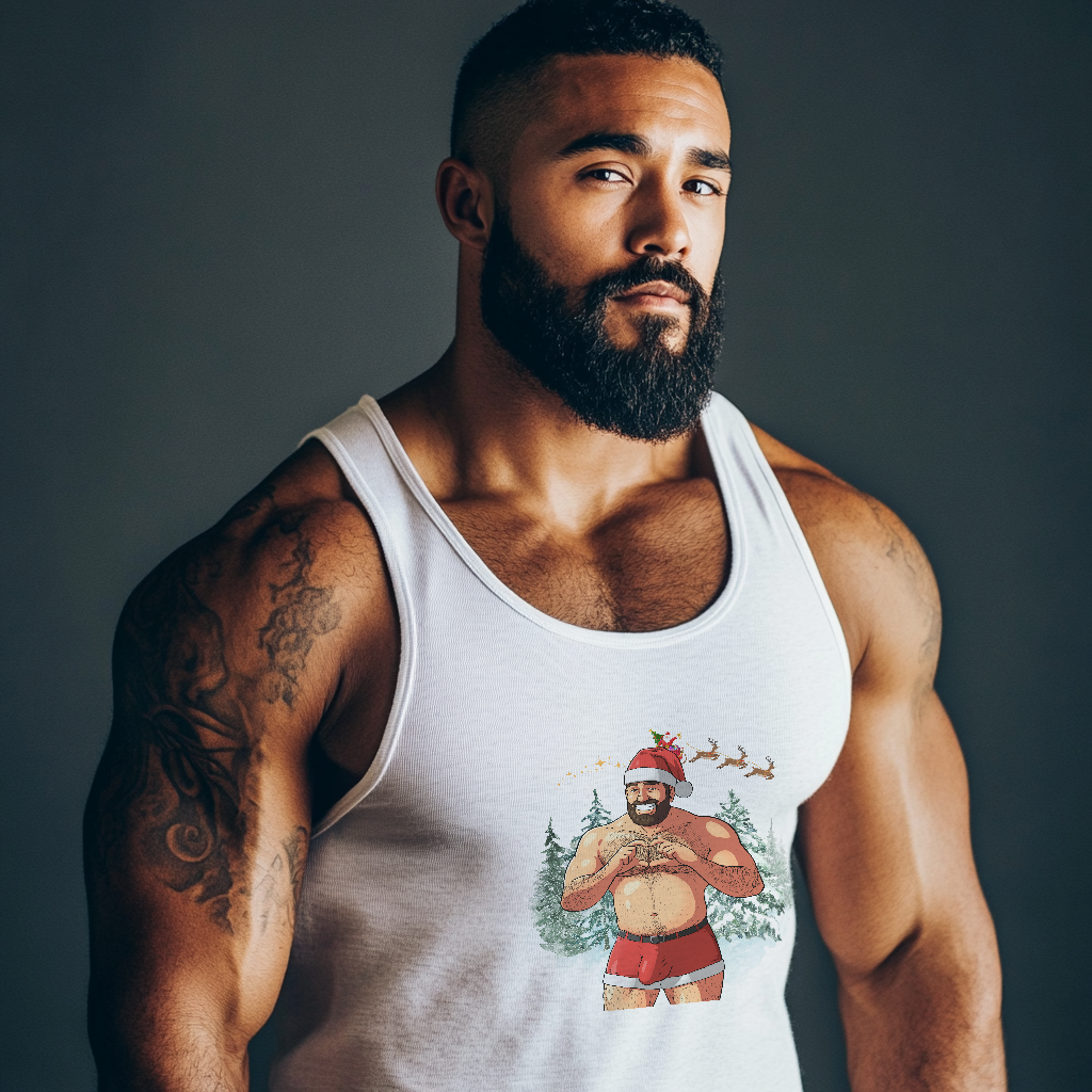 Unveil the holiday spirit with our daring and playful Big Dick (I mean Nick) Energy Tank, White Edition, featuring a charismatic twist on Santa himself. This sexy shirtless muscle bear Santa knows you've been a little naughty, so he's arrived in his iconic red and white velveteen shorts, carrying a generous package just waiting to be unwrapped. Are you ready for the surprise? Whether you're catching eyes at a festive gathering or infusing a hint of playful charm into your winter attire, this tank top is bound to leave a lasting mark. Its comfortable fit and soft fabric make it a cozy choice for celebrating the season in style. Get ready to embrace the holidays with a touch of humor and a whole lot of flair, courtesy of our "Big Nick Energy" top.