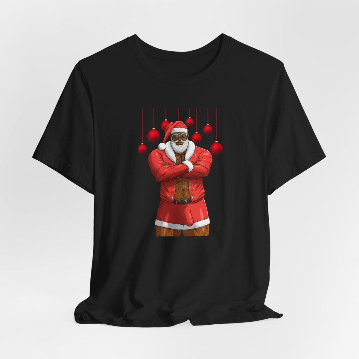 Celebrate the holiday season in style with our "Santa Daddy, Jingle Balls, White Edition" Bella+Canvas 3001 tee – a playful twist on classic festive traditions! This tee features a charismatic and alluring grey-haired Santa Daddy, proudly sporting a generous package in his Santa shorts, and an open jacket that reveals his muscled, hairy chest. It's a whimsical take on the beloved holiday icon.