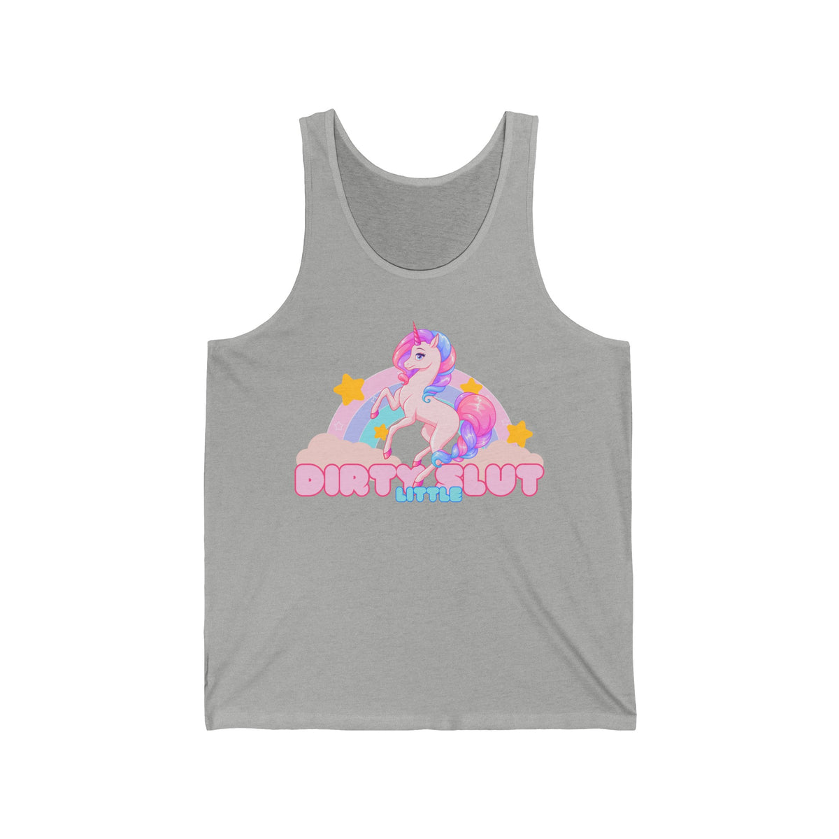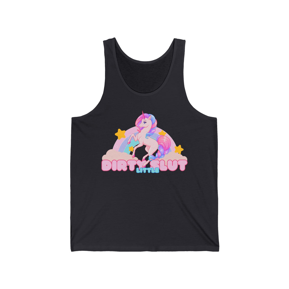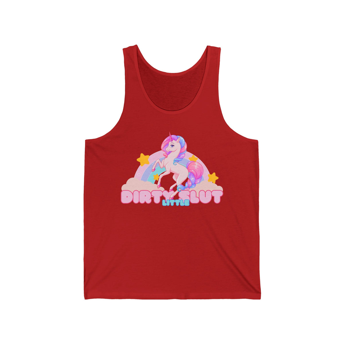 Introducing our daring "Dirty Little Slut" Tank, designed to bring out your provocative side. This eye-catching design features an adorable unicorn graphic set against a whimsical backdrop of rainbows and stars, adding a touch of innocence to your bold statement. Crafted from soft, premium materials, this tee ensures maximum comfort for all your playful escapades. Whether you're lounging at home or stepping out for some naughty fun, this shirt is the perfect blend of cute and cheeky.