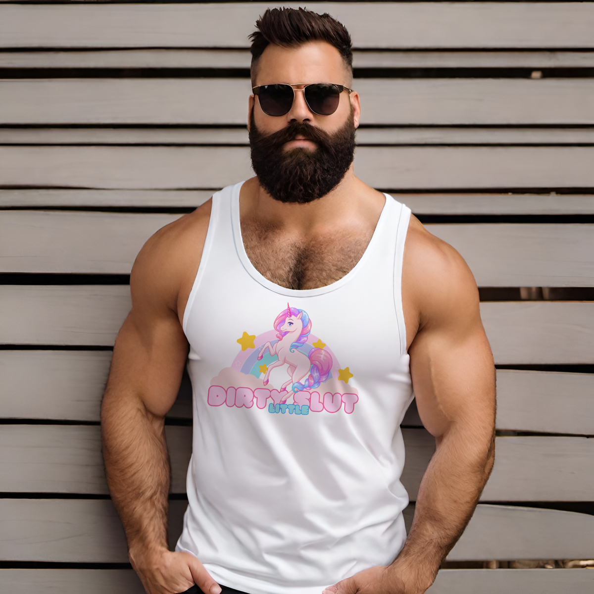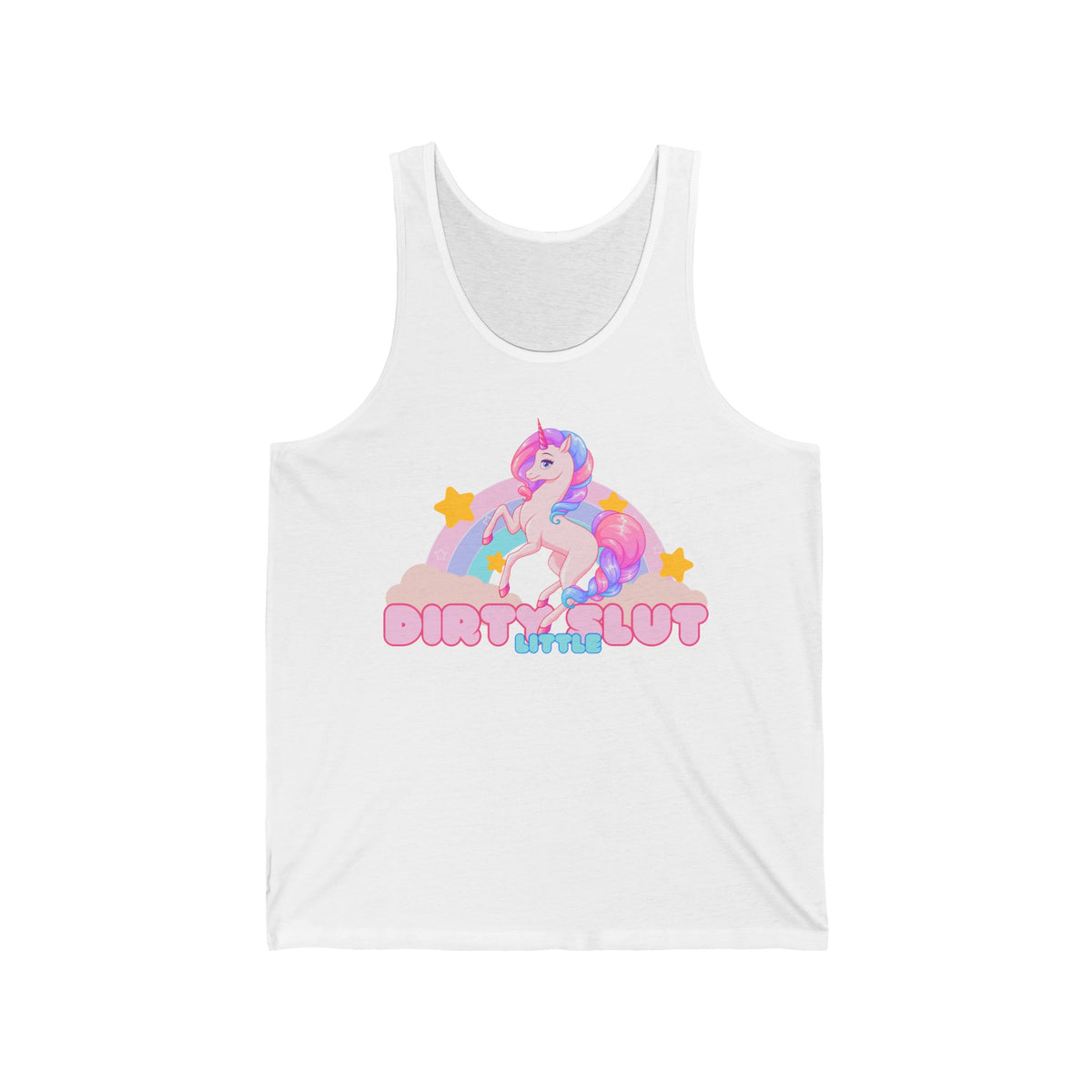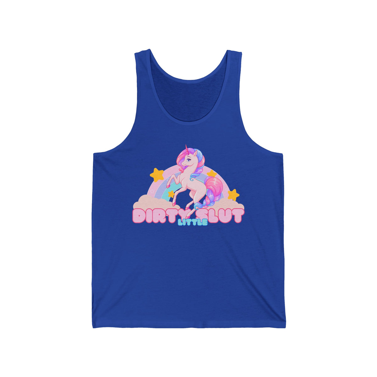 Introducing our daring "Dirty Little Slut" Tank, designed to bring out your provocative side. This eye-catching design features an adorable unicorn graphic set against a whimsical backdrop of rainbows and stars, adding a touch of innocence to your bold statement. Crafted from soft, premium materials, this tee ensures maximum comfort for all your playful escapades. Whether you're lounging at home or stepping out for some naughty fun, this shirt is the perfect blend of cute and cheeky.