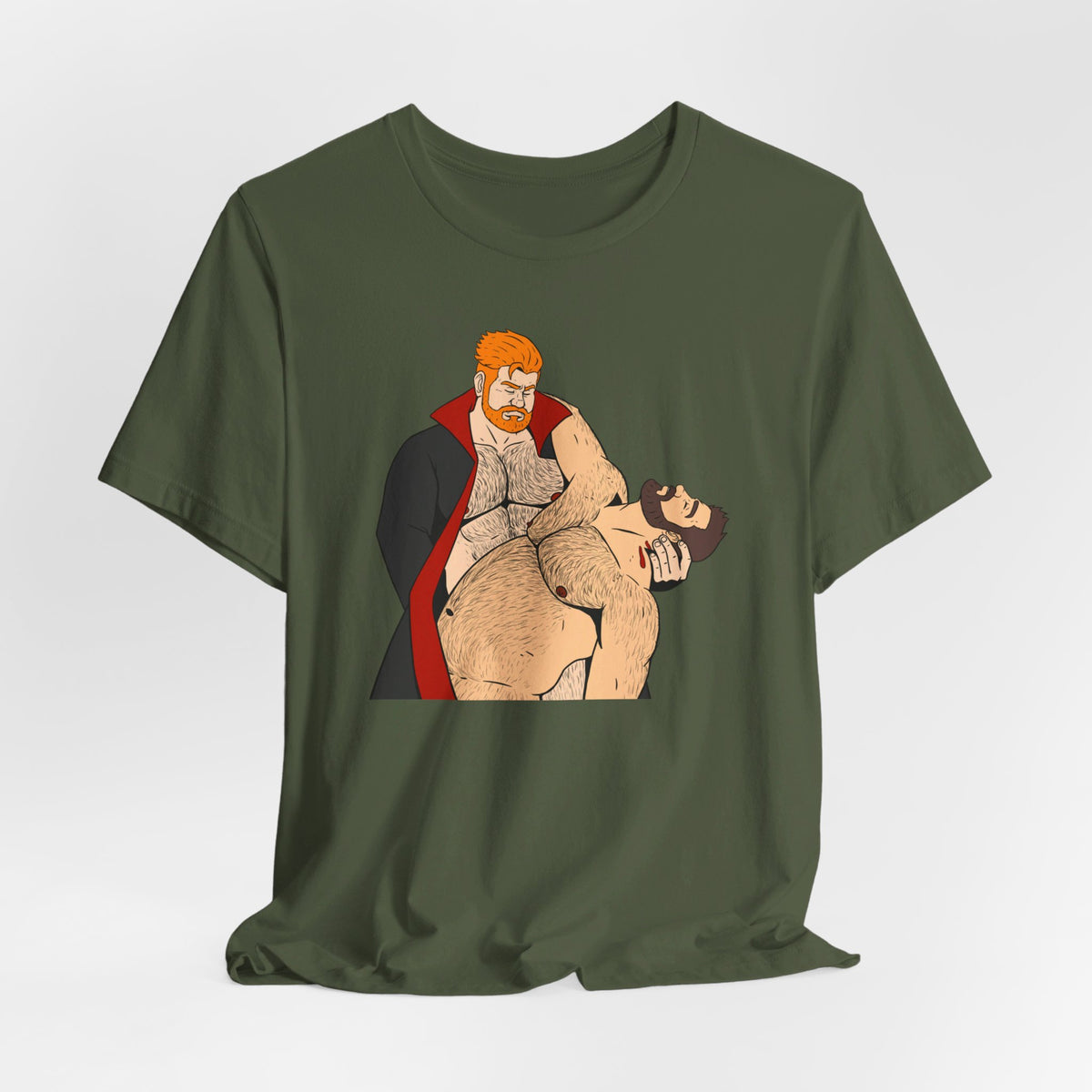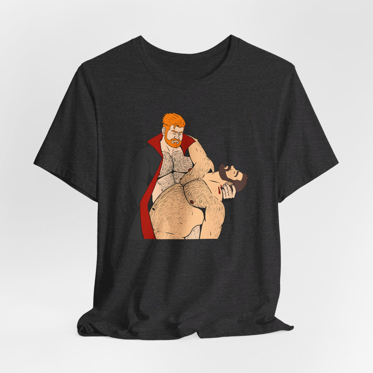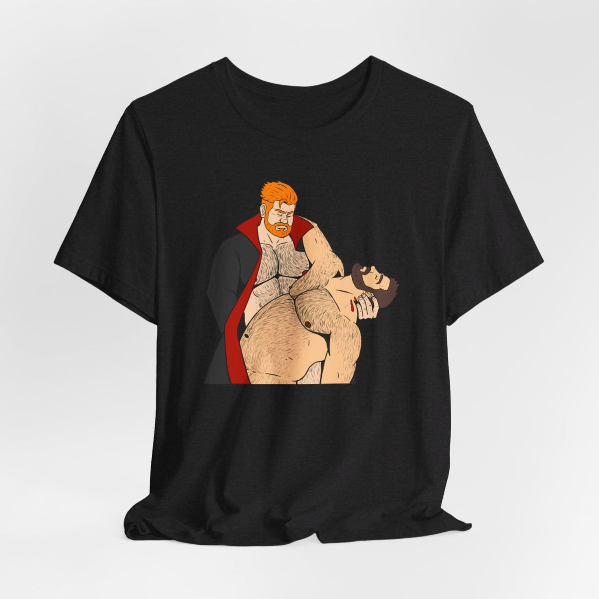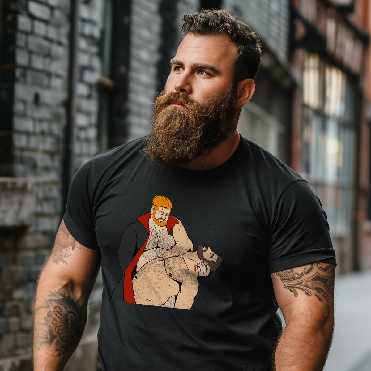 As Halloween draws near, our 'Eternal Twilight' fitted tee brings an alluring mystique to your costume collection. Embrace the dark and seductive theme of vampires as Matthieu, a beefy muscle bear, converts his soon-to-be consort through the bite of love. With this fitted tee, you'll find both comfort and style as you unleash your inner vampire for a night of thrilling festivities. Let the allure of the night take hold, and make a bold statement with this captivating tee.