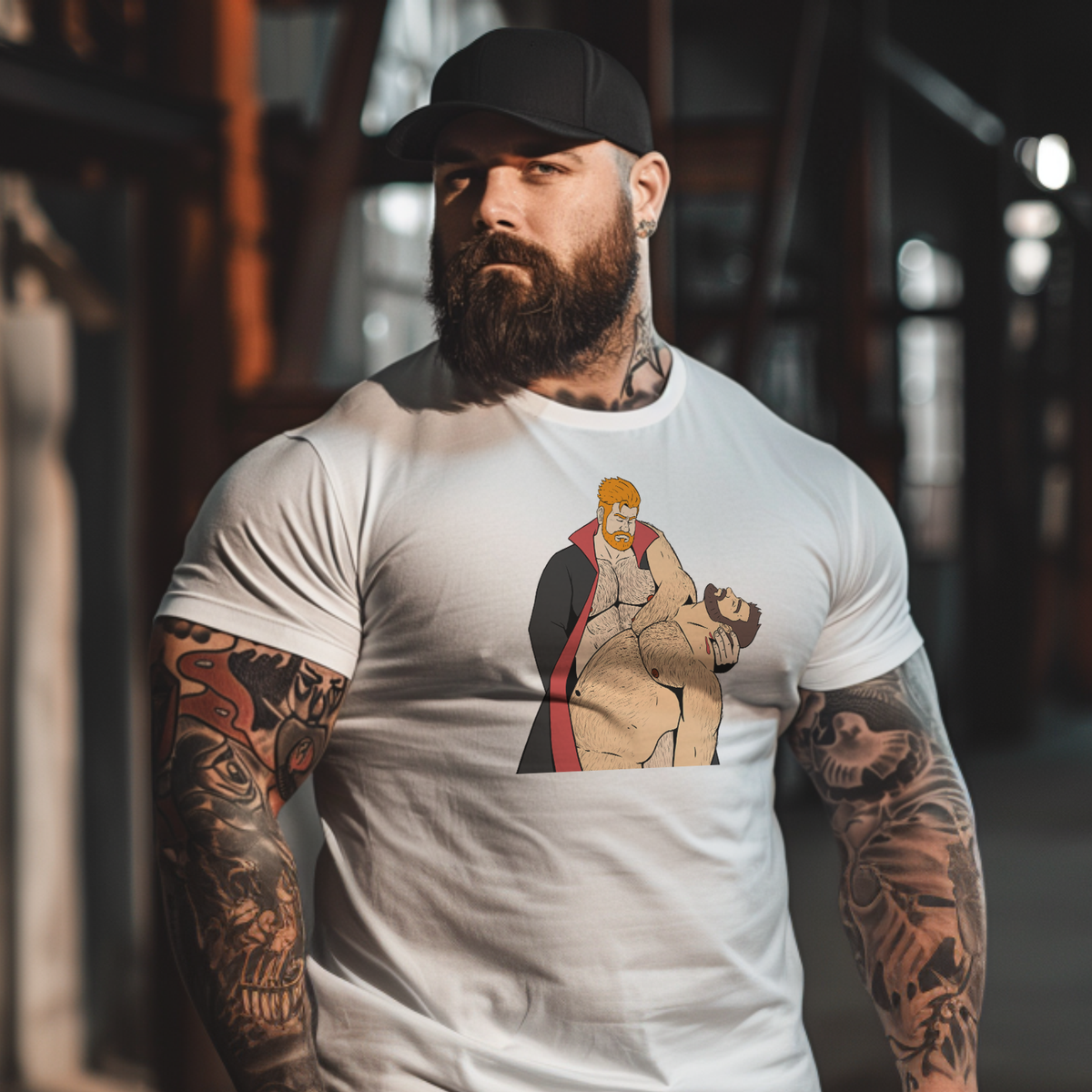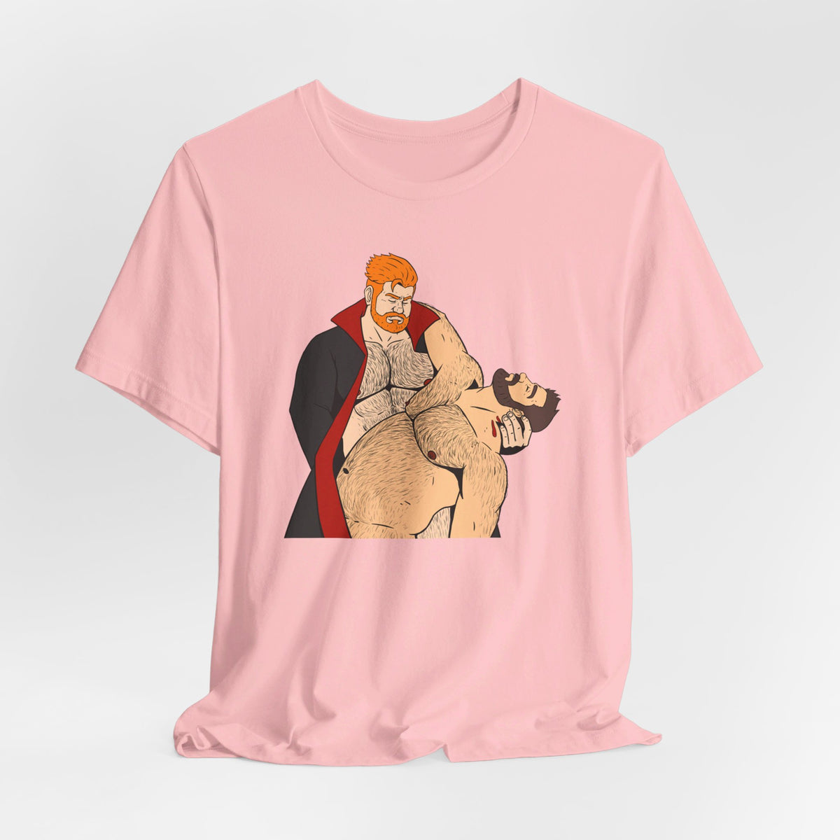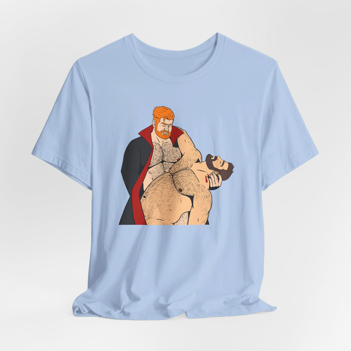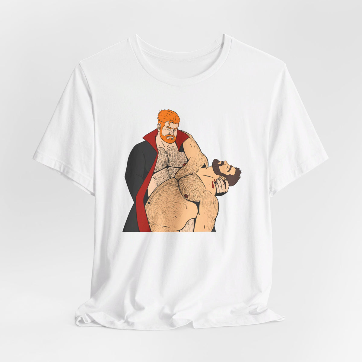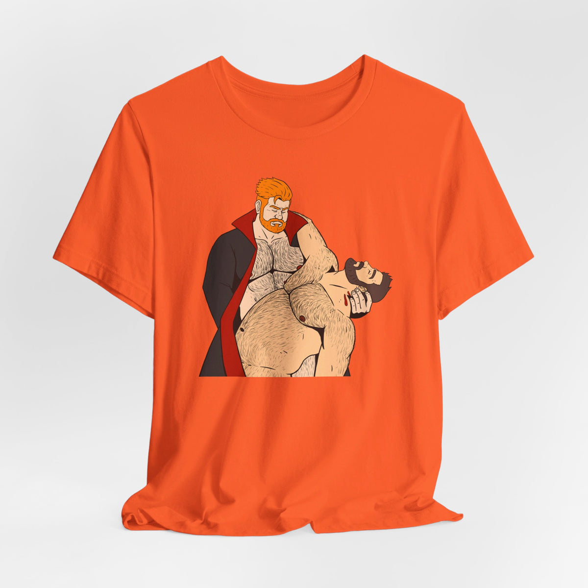 As Halloween draws near, our 'Eternal Twilight' fitted tee brings an alluring mystique to your costume collection. Embrace the dark and seductive theme of vampires as Matthieu, a beefy muscle bear, converts his soon-to-be consort through the bite of love. With this fitted tee, you'll find both comfort and style as you unleash your inner vampire for a night of thrilling festivities. Let the allure of the night take hold, and make a bold statement with this captivating tee.