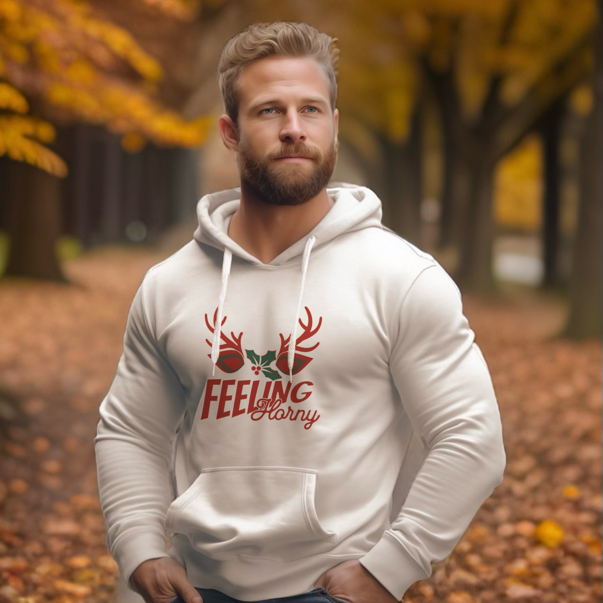 Announce your willingness to mingle under the mistletoe with our “Feeling Horny” hoodie, bringing a playful twist to Christmas festivities. Featuring bold antlers and a sprig of holly, this design is a fun nod to the holiday season with a hint of sass. Perfect for those who enjoy standing out from the crowd and embracing a little extra mischief under the mistletoe. Whether you’re celebrating at a holiday party or just want to spread some laughter, this shirt is a sure way to turn heads and keep the season light-hearted. Designed for those who aren’t afraid to bring humor to their holiday wardrobe, it’s an ideal gift or personal statement piece that says you’re feeling festive… and maybe a bit “horny” too.