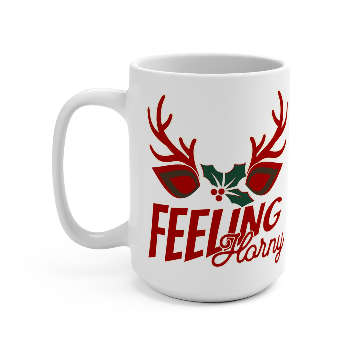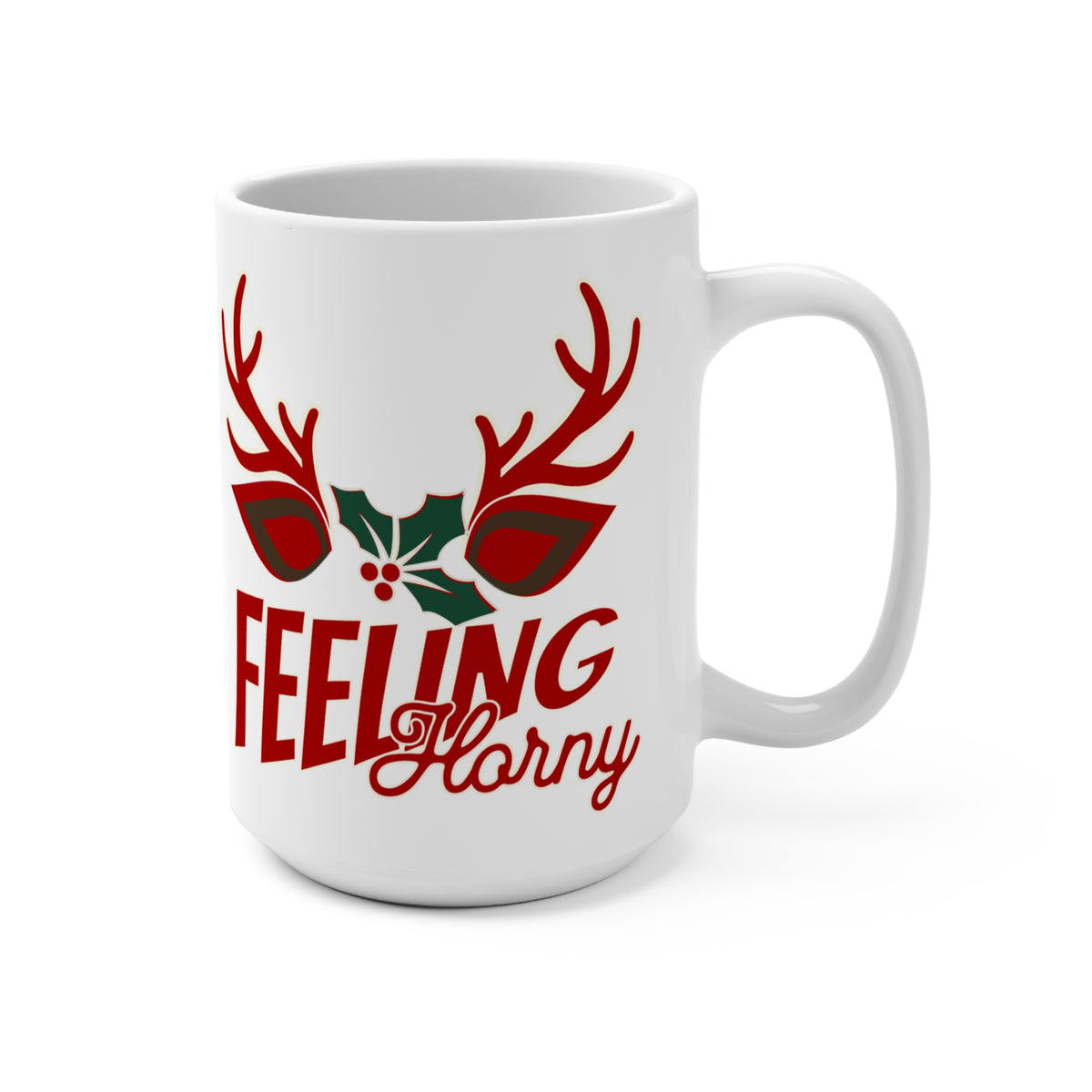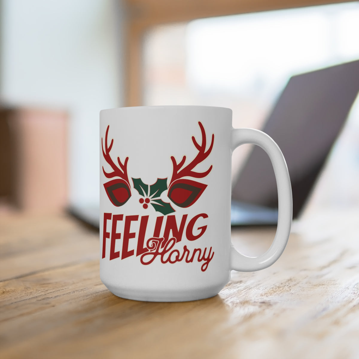 This adult themed kinky 15oz ceramic coffee mug with the phrase 'Feeling Horny' offers a playful and humorous vibe. Perfect for those with a sense of humor and looking for a unique gift for a friend, partner, or themselves. Ideal for Christmas, White Elephant gift exchanges, or adult-themed parties.