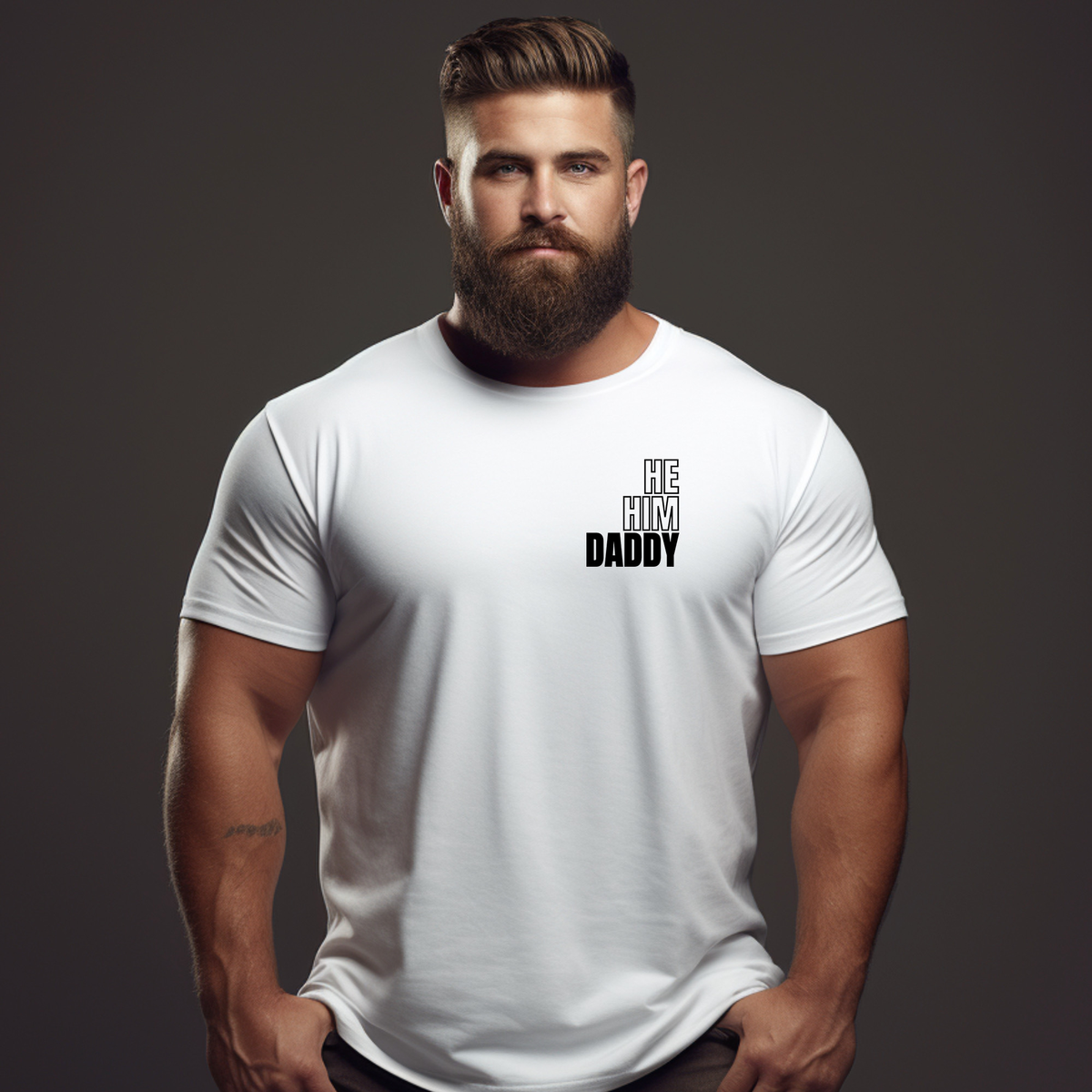 Show off your unapologetic identity with our 'He/Him/Daddy' tee. This Tee is a bold statement of self, designed for all the resolute and assertive daddies out there. Constructed with the same high-quality standards you'd expect from Bella+Canvas, this tee provides enduring comfort, durability, and a soft fit that holds up even on your busiest days. Let this tee serve as a powerful affirmation of your true self. Wear your pronouns, assert your role, and make zero apologies for the trailblazing identity you embody. With our 'He/Him/Daddy' tee, step into a realm of fearless self-expression. Welcome, all you wonderful Daddies! Your time to shine is now.