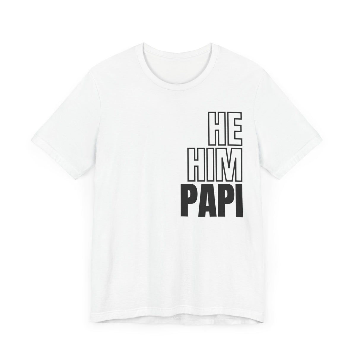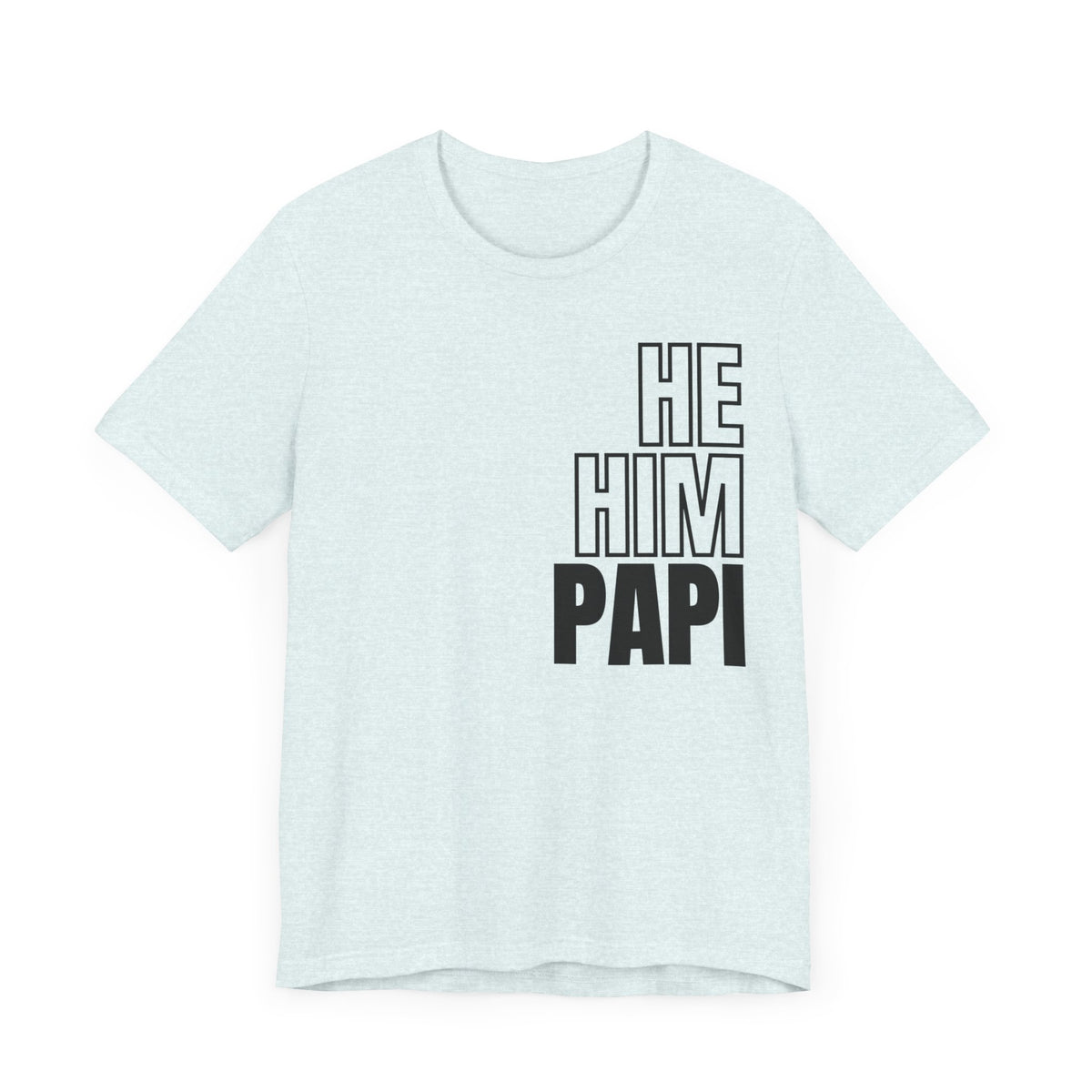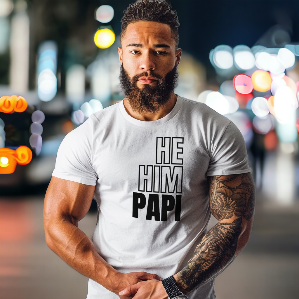 Show off your unapologetic identity with our 'He/Him/Papi' tee. This tee is a bold statement of self, designed for all the resolute and assertive daddies out there. Constructed with the same high-quality standards you'd expect from Bella+Canvas, this tee provides enduring comfort, durability, and a soft fit that holds up even on your busiest days. Let this tee serve as a powerful affirmation of your true self. Wear your pronouns, assert your role, and make zero apologies for the trailblazing identity you embody. With our 'He/Him/Papi' tee, step into a realm of fearless self-expression. Welcome, all you audacious, wonderful Papis! Your time to shine is now.