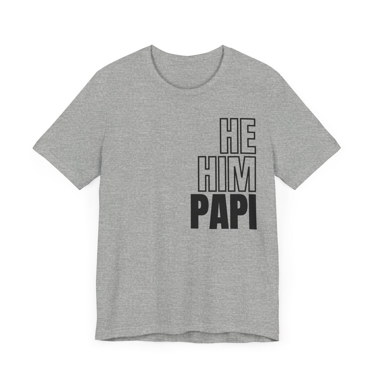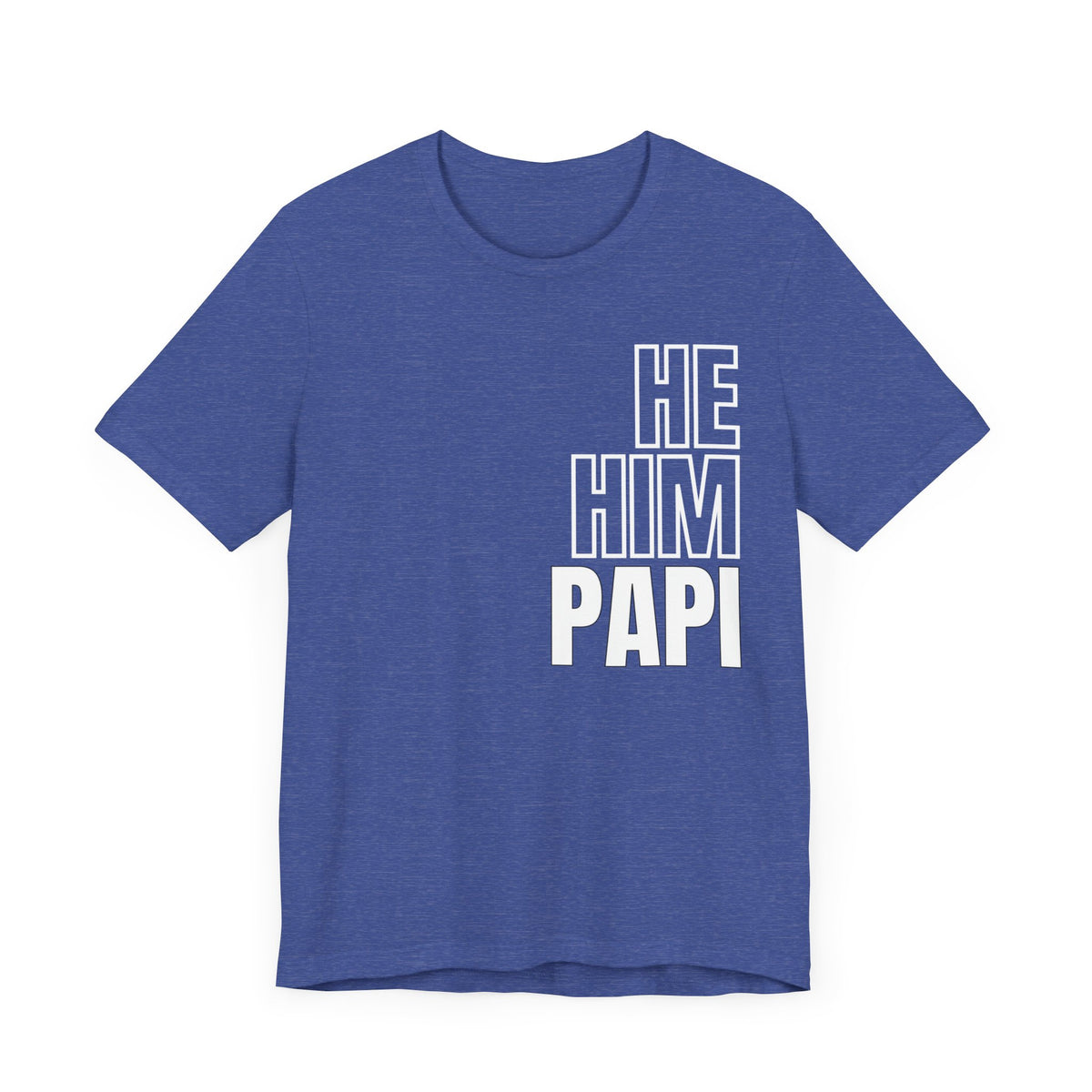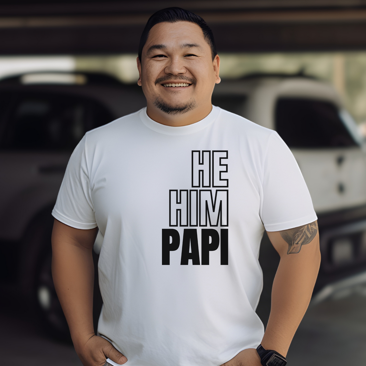 Show off your unapologetic identity with our 'He/Him/Papi' tee. This tee is a bold statement of self, designed for all the resolute and assertive daddies out there. Constructed with the same high-quality standards you'd expect from Bella+Canvas, this tee provides enduring comfort, durability, and a soft fit that holds up even on your busiest days. Let this tee serve as a powerful affirmation of your true self. Wear your pronouns, assert your role, and make zero apologies for the trailblazing identity you embody. With our 'He/Him/Papi' tee, step into a realm of fearless self-expression. Welcome, all you audacious, wonderful Papis! Your time to shine is now.