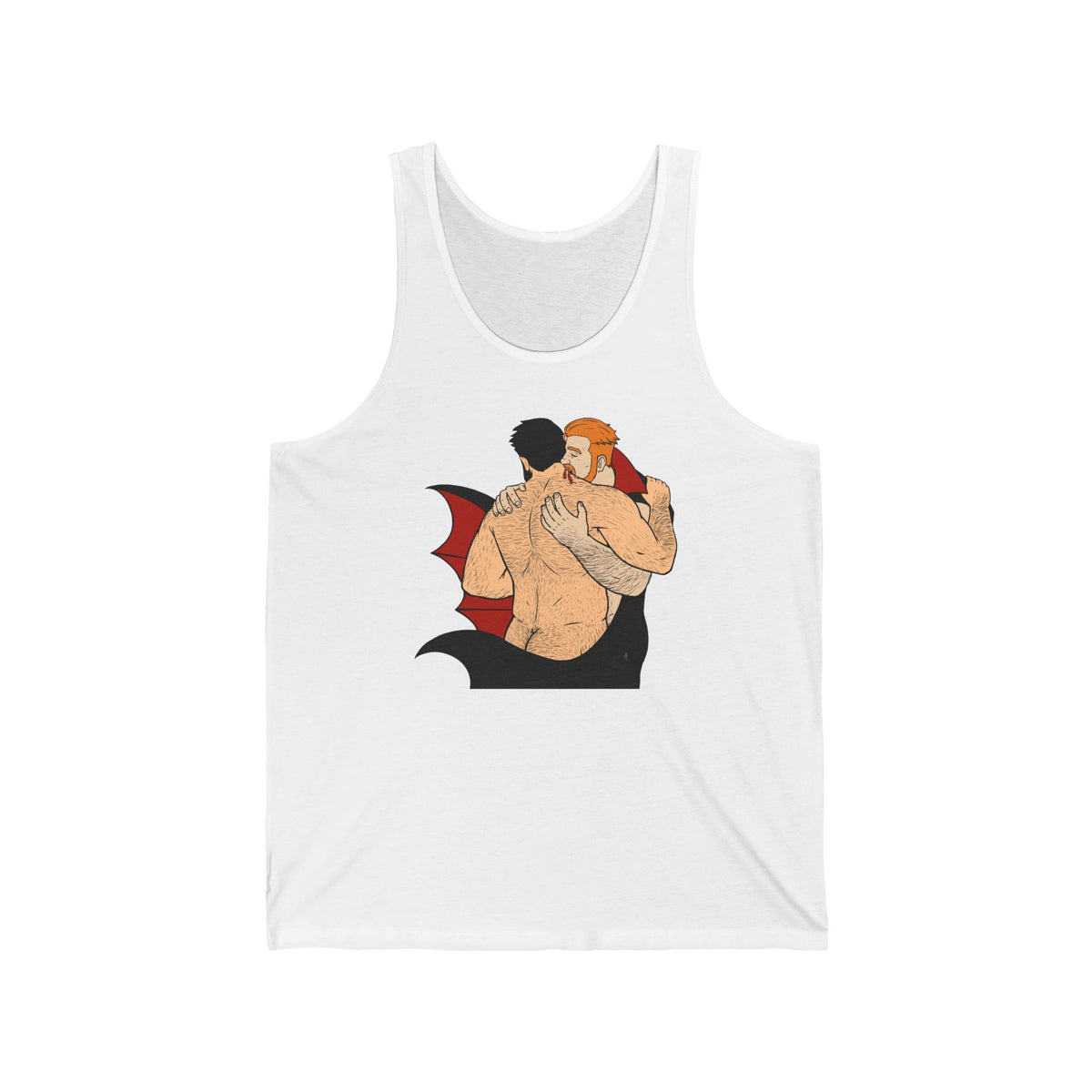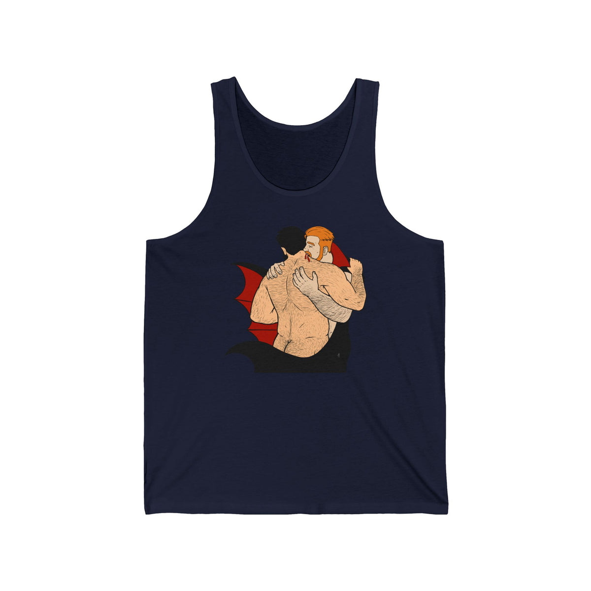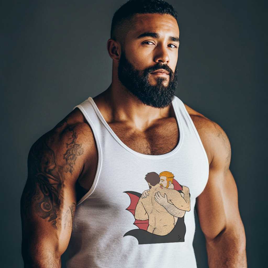 As Halloween draws near, our 'Love at First Bite' Bella+Canvas 3480 tank brings an alluring mystique to your costume collection. Embrace the dark and seductive theme of vampires as Matthieu, a beefy muscle bear, converts his soon-to-be consort through the bite of love.