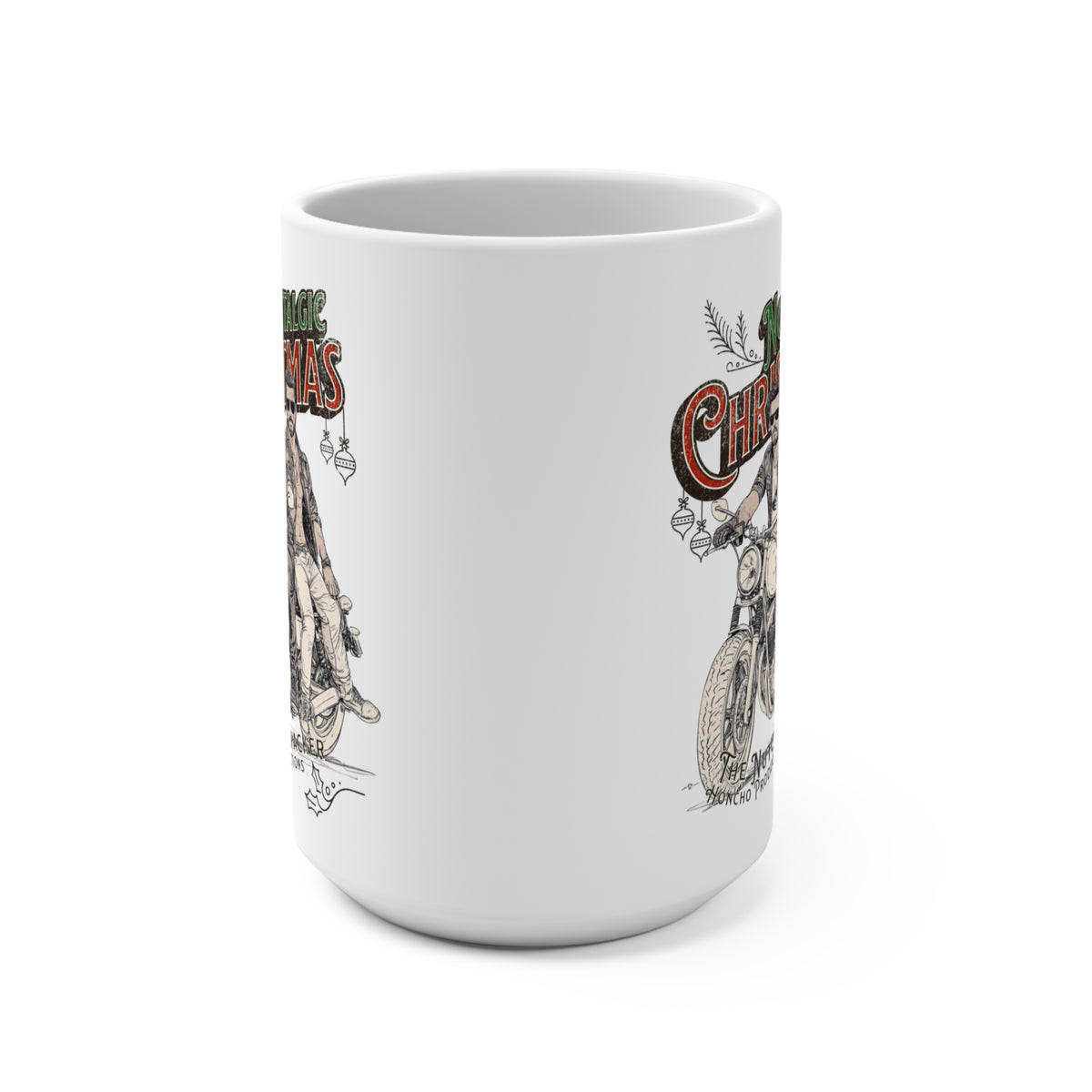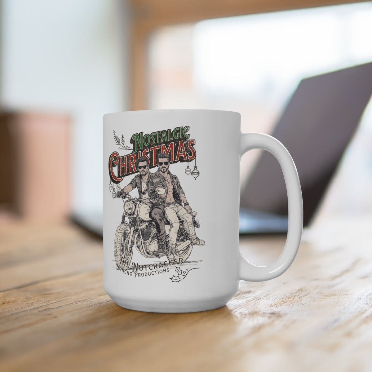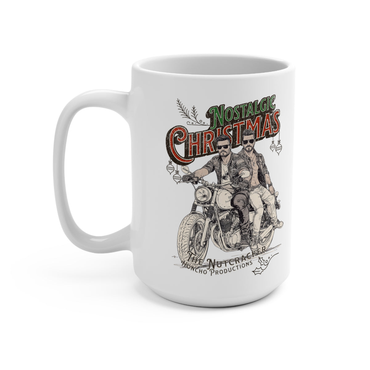 Nostalgic Gay Christmas 15oz Ceramic Coffee Mug inspired by Vintage Leather Culture and LGBT Pride. Perfect for Muscle Bear Bikers and fans of Honcho Magazine. Made to order, dishwasher and microwave safe.
