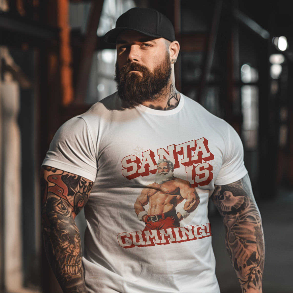 Embrace your playful side, celebrate Christmas with a wink, and let this beefed-up Santa spread his unique brand of joy. Ideal for kink-friendly celebrations or anyone looking to add a bit of edge to their holiday attire, this tee is bound to make you the center of attention.