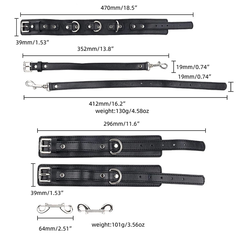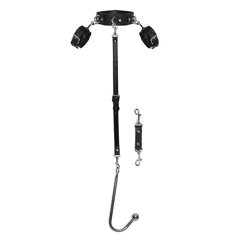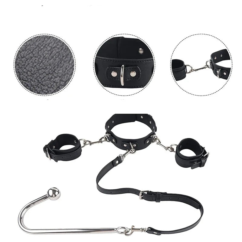 Introducing our latest collection in personal adventure: our sleek, innovative Anal Hooks set, designed for those who dare to explore new horizons of pleasure and control. This exclusive series features a sophisticated PU leather collar with attached handcuffs, complemented by three distinct versions of anal hooks, each crafted for a unique experience. The hooks, fashioned from medical grade stainless steal materials, promise both durability and comfort, while the accompanying leather collar and cuffs add a touch of elegance and restraint that appeals to the connoisseur of exquisite encounters.