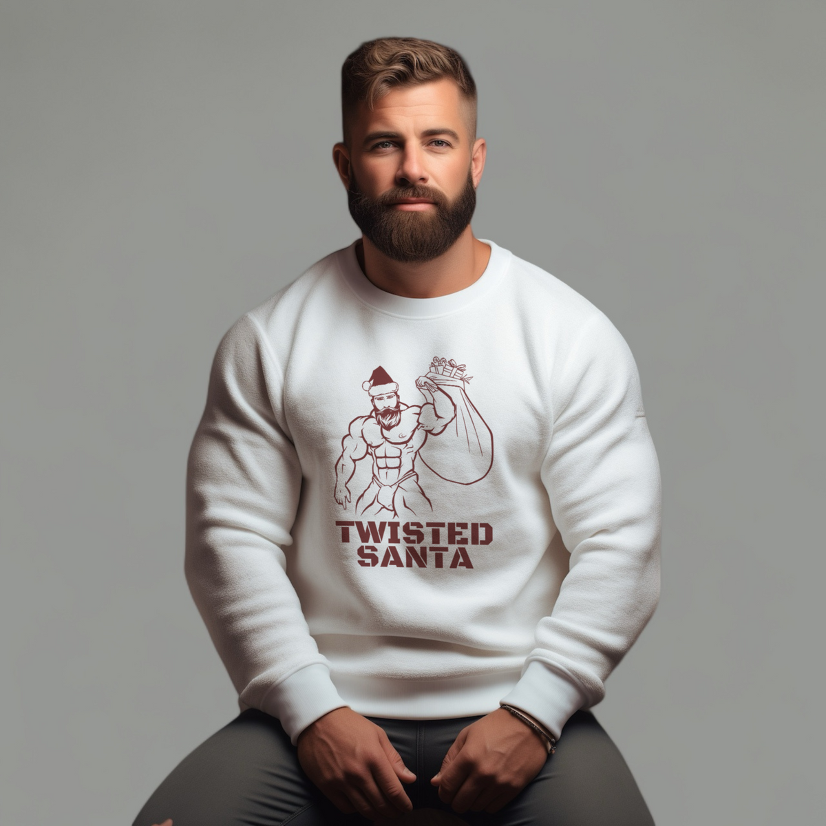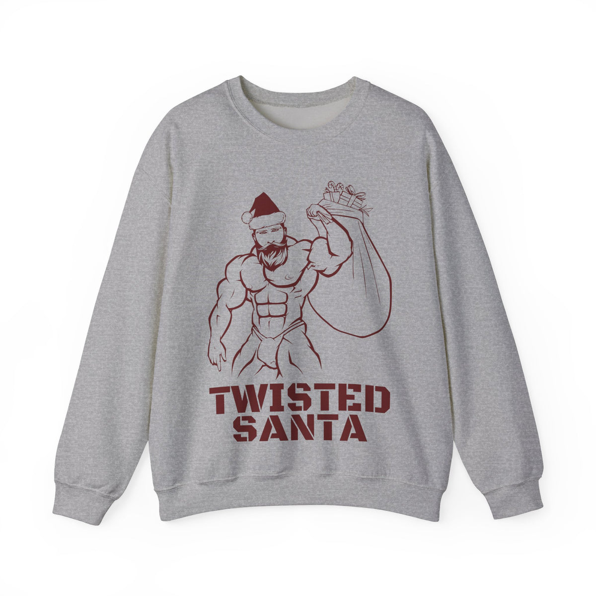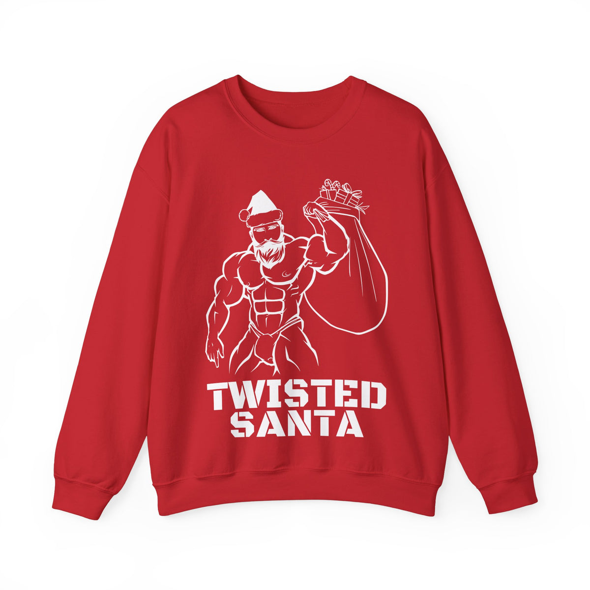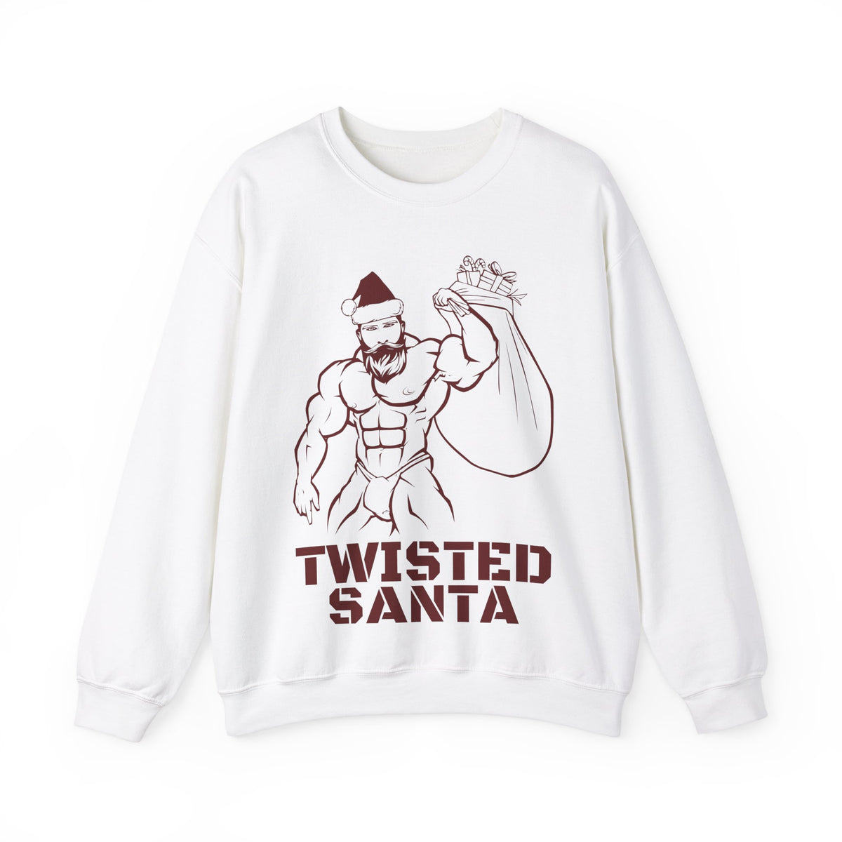 You don't need to get twisted because you are already there. Embrace the playful side of the holidays with our "Twisted Santa" pullover. This unique design showcases a rugged outline drawing of a muscle-bound Santa, complete with a festive Santa's hat and confidently carrying a colossal sac of toys. But hold on tight, because this Santa is ready to spread more than just what's in his sac! Whether you're aiming to make a bold statement at a festive gathering or simply want to infuse your winter wardrobe with a playful touch, the "Twisted Santa" pullover is the perfect choice.