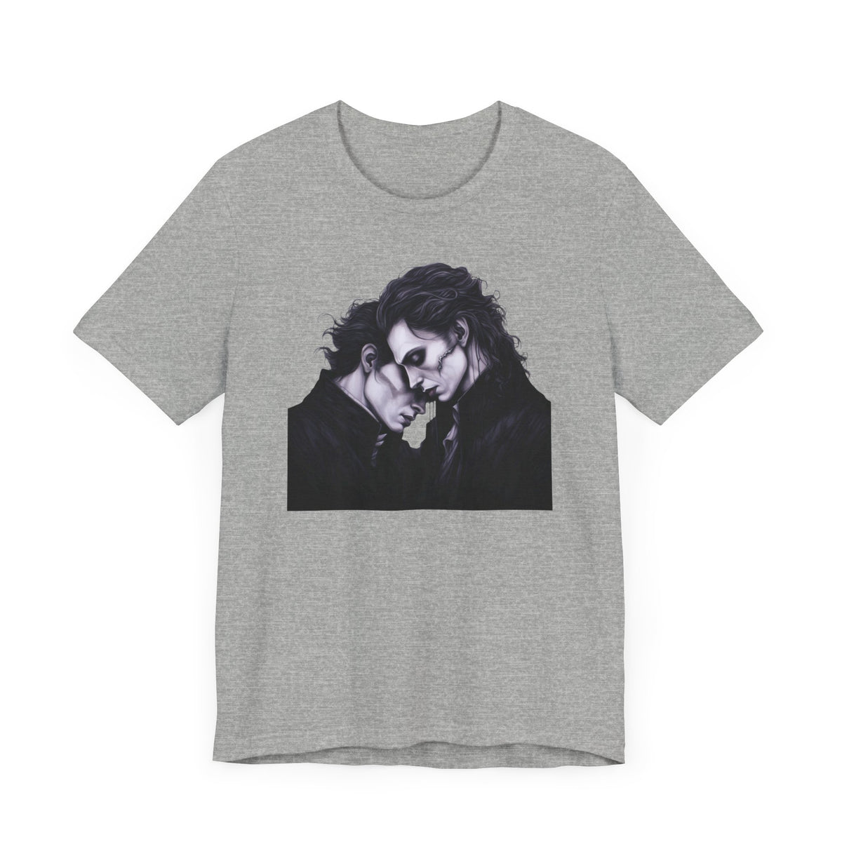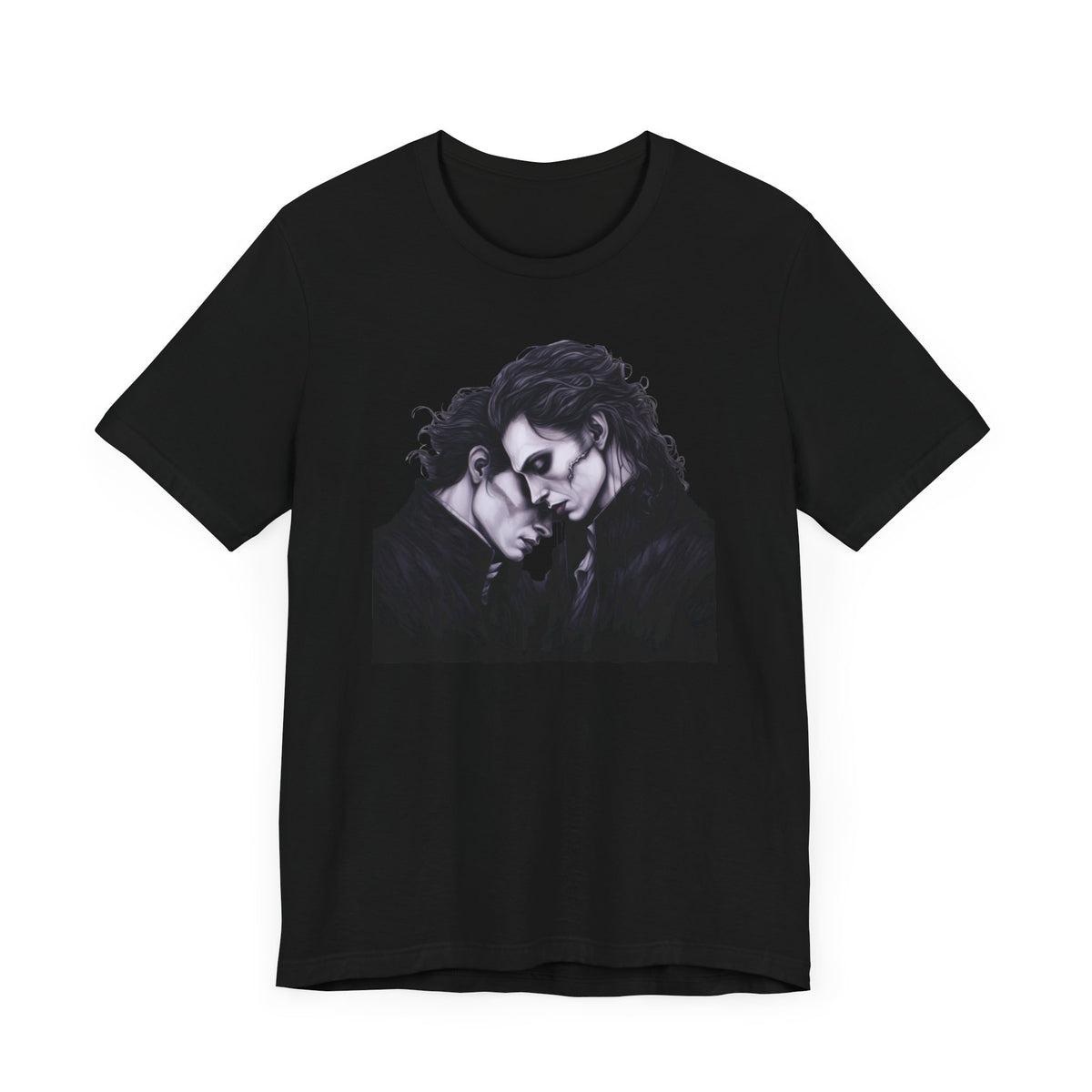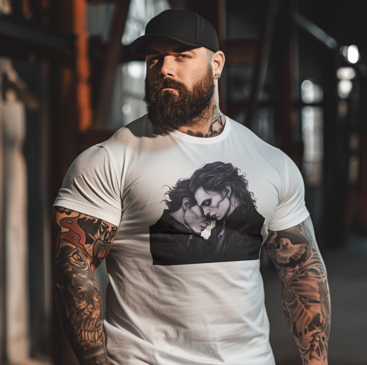Our Vampire Love Tee is more than just a piece of clothing—it's a hauntingly romantic statement. Featuring two male vampires in a tender embrace, this tee is perfect for Halloween, Valentine’s Day, or any time you want to express eternal love with a dark, gothic flair. The melancholic artwork captures the passion and devotion of a love that endures beyond death, making it a bold and emotional addition to any wardrobe.