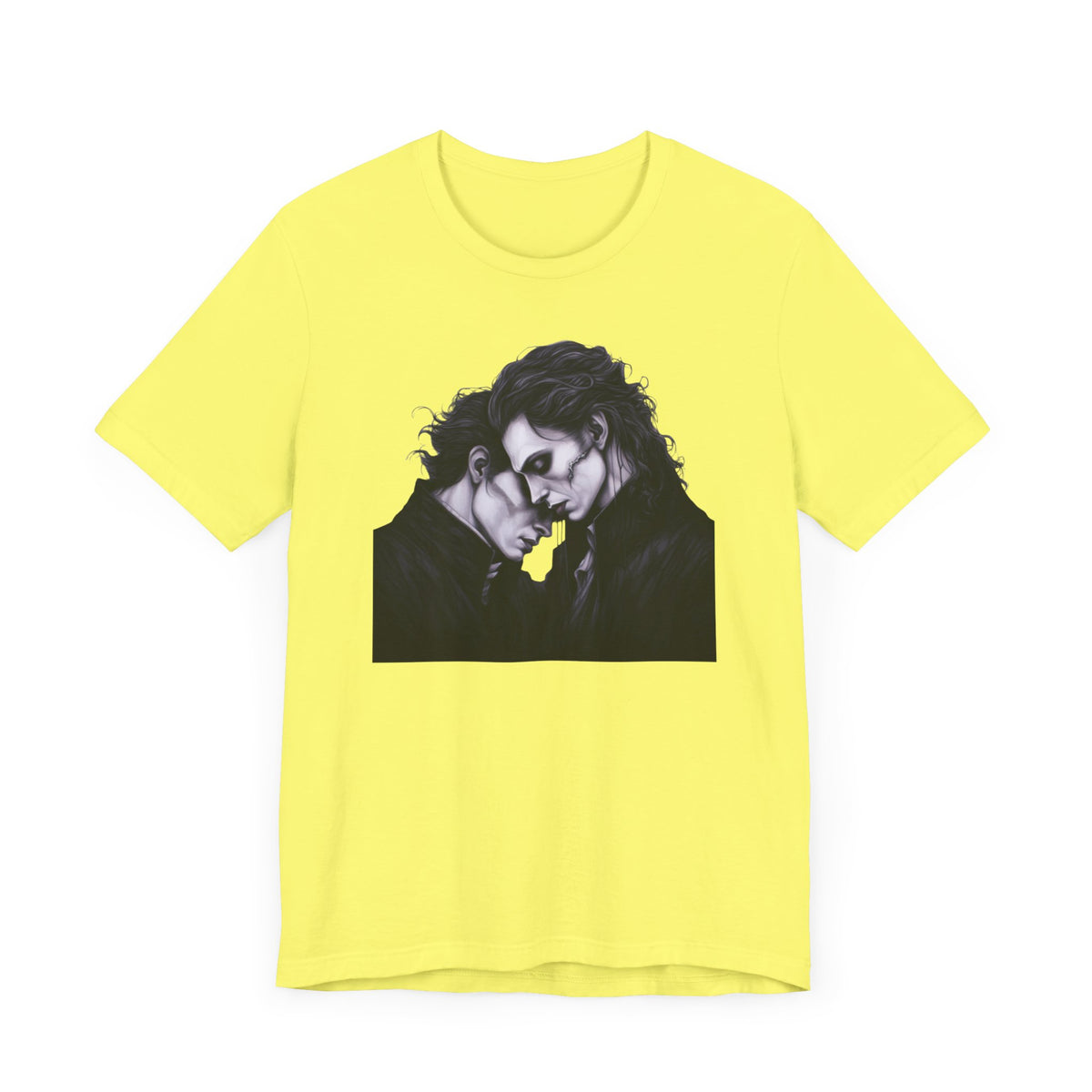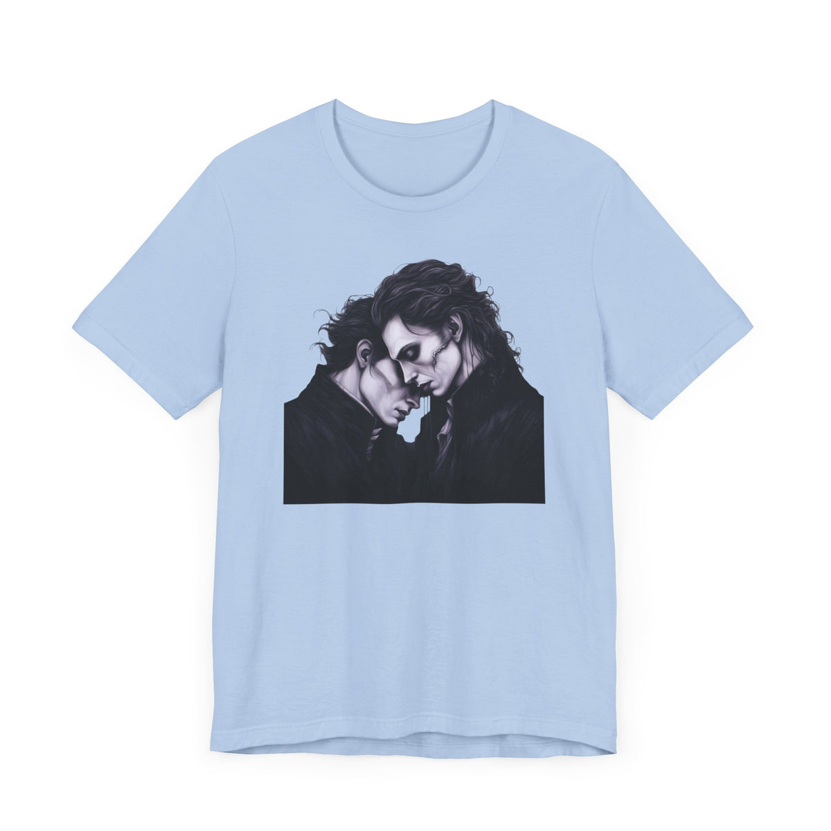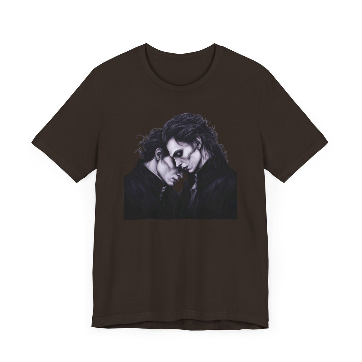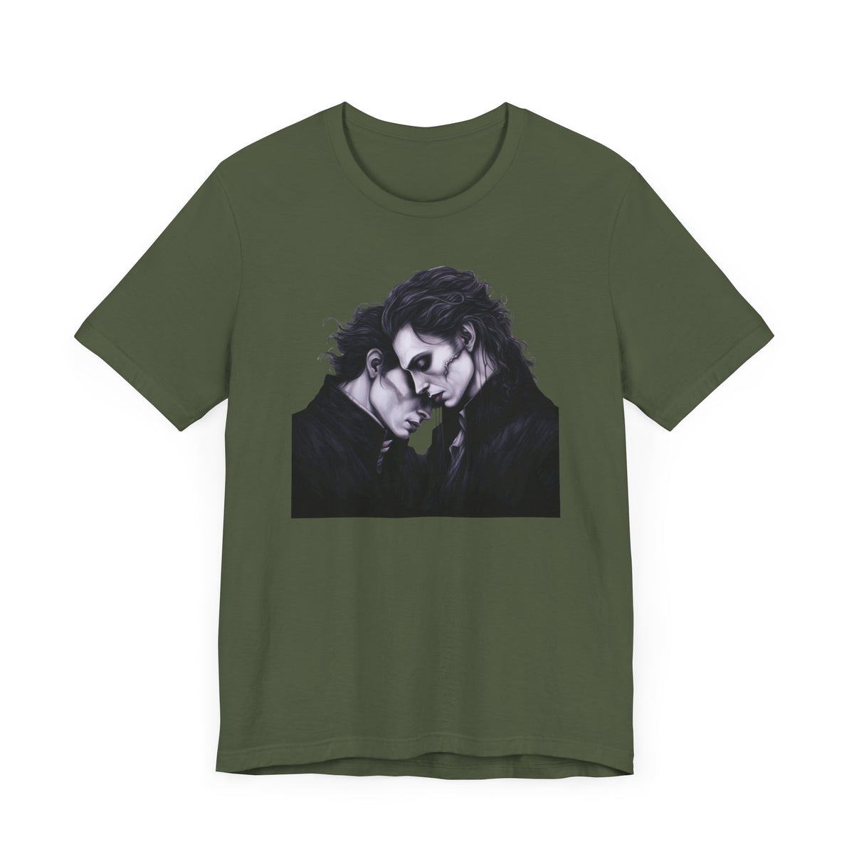Our Vampire Love Tee is more than just a piece of clothing—it's a hauntingly romantic statement. Featuring two male vampires in a tender embrace, this tee is perfect for Halloween, Valentine’s Day, or any time you want to express eternal love with a dark, gothic flair. The melancholic artwork captures the passion and devotion of a love that endures beyond death, making it a bold and emotional addition to any wardrobe.