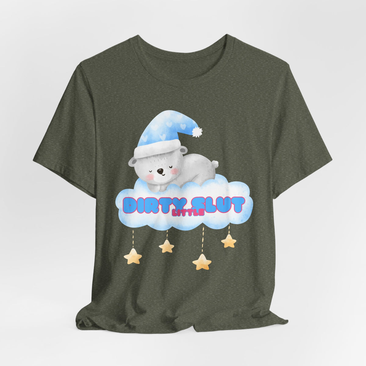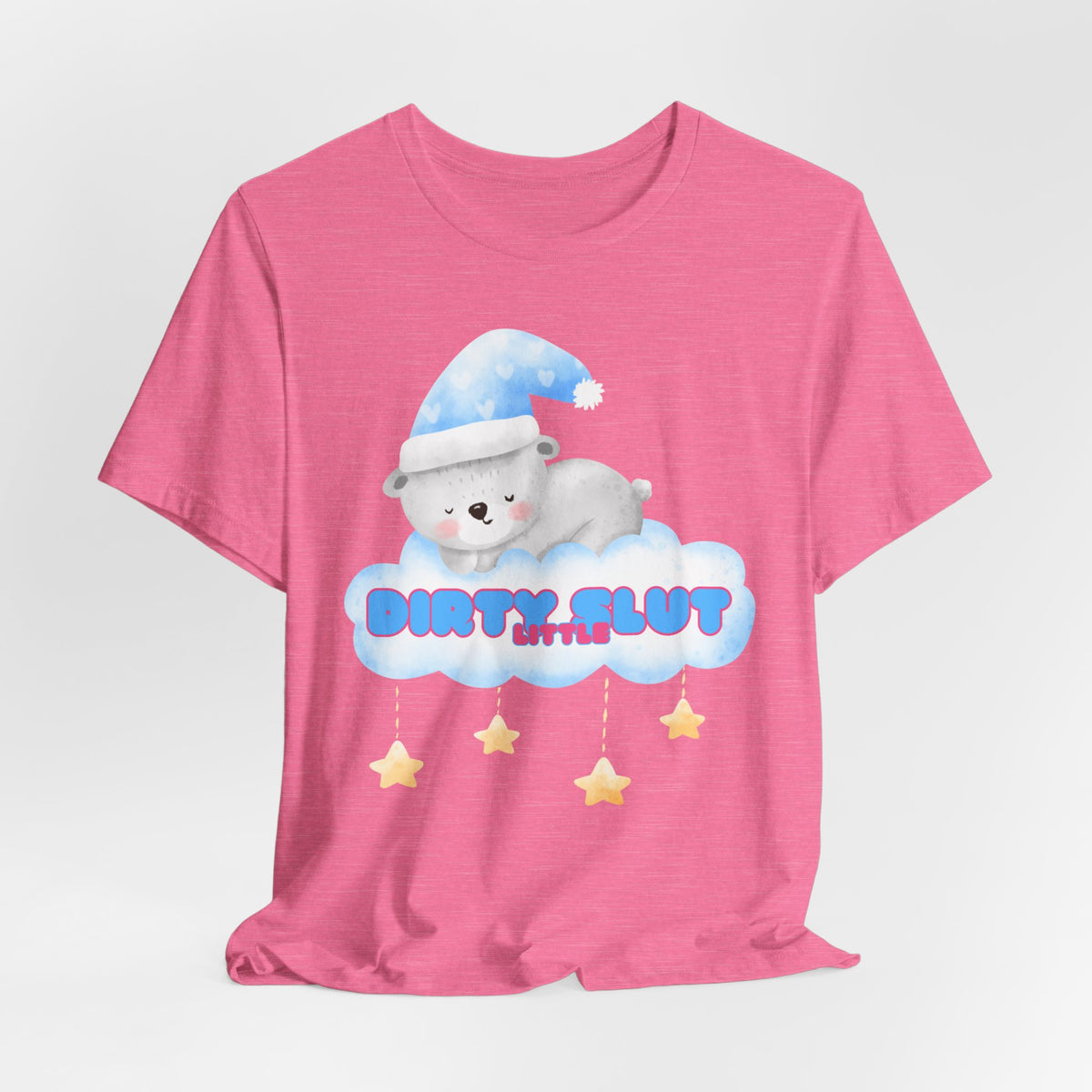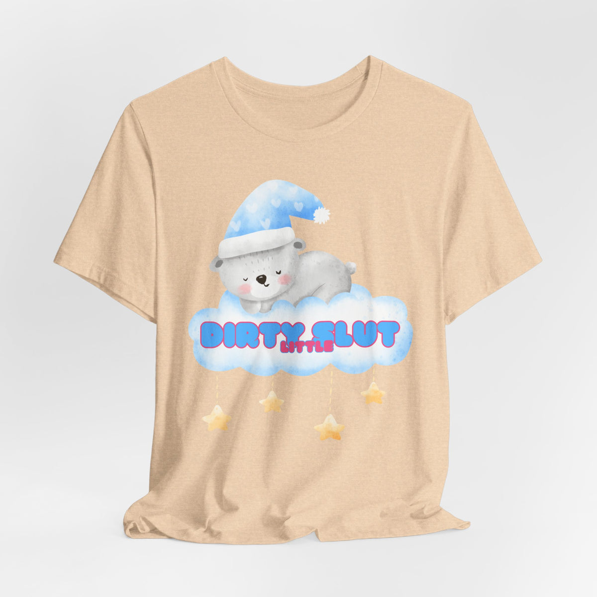 Snuggle up in our irresistibly adorable "Dirty Little Slut" Tee, designed to bring out your playful side. This flirty design features a cute, sleepy bear nestled on a cloud, wearing a cozy nightcap and surrounded by dangling stars. Made from the softest material, this tee is perfect for those who love a touch of sweetness mixed with a bit of naughty fun.