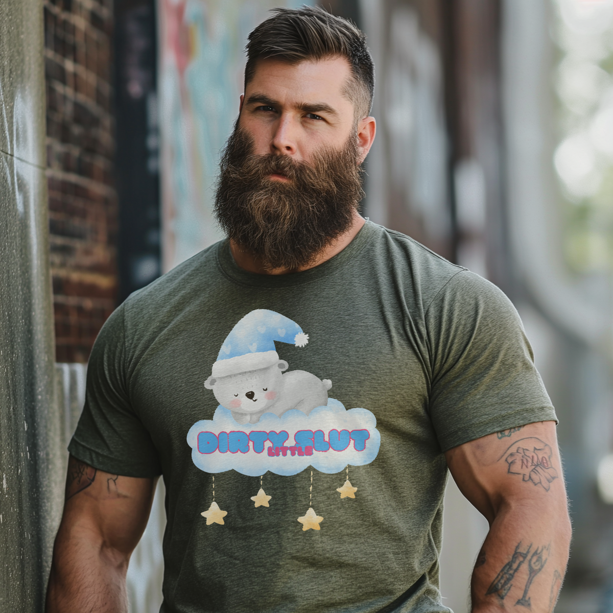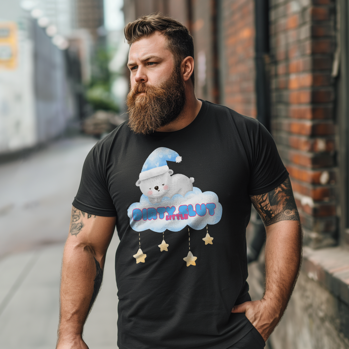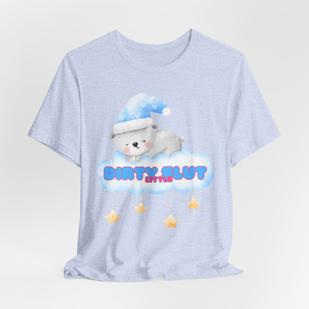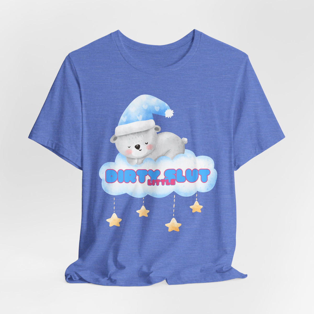 Snuggle up in our irresistibly adorable "Dirty Little Slut" Tee, designed to bring out your playful side. This flirty design features a cute, sleepy bear nestled on a cloud, wearing a cozy nightcap and surrounded by dangling stars. Made from the softest material, this tee is perfect for those who love a touch of sweetness mixed with a bit of naughty fun.