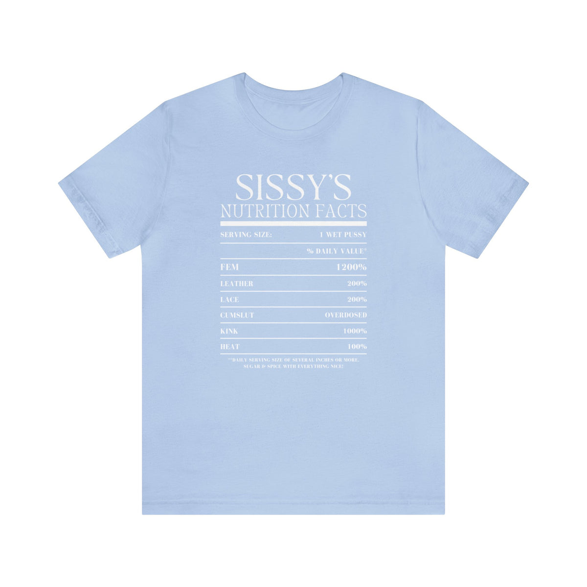 Whether you're looking to add a spark of fun to your own collection or searching for the perfect gift for someone who appreciates a blend of wit and daring fashion, the Sissy's Nutrition Facts Tee on a Bella + Canvas 3001 is sure to deliver comfort, style, and a good laugh. This classic unisex jersey short sleeve tee fits like a well-loved favorite. Soft cotton and quality print make users fall in love with it over and over again. These t-shirts have-ribbed knit collars to bolster shaping. The shoulders are tapered for a better fit over time. Dual side seams hold the garment's shape for longer.
