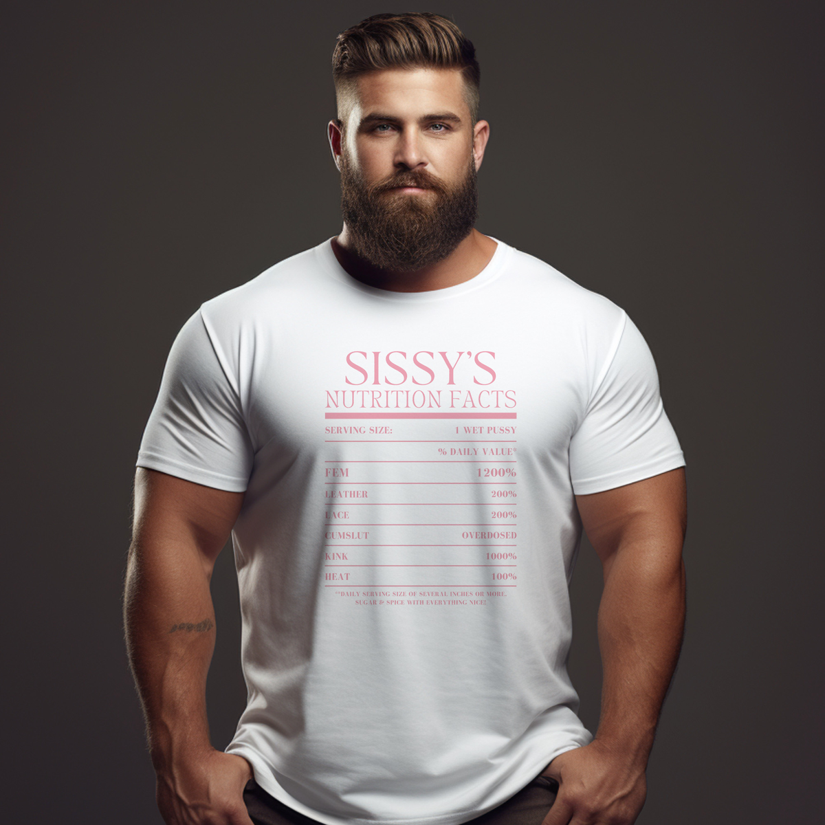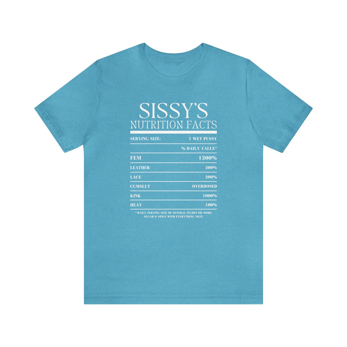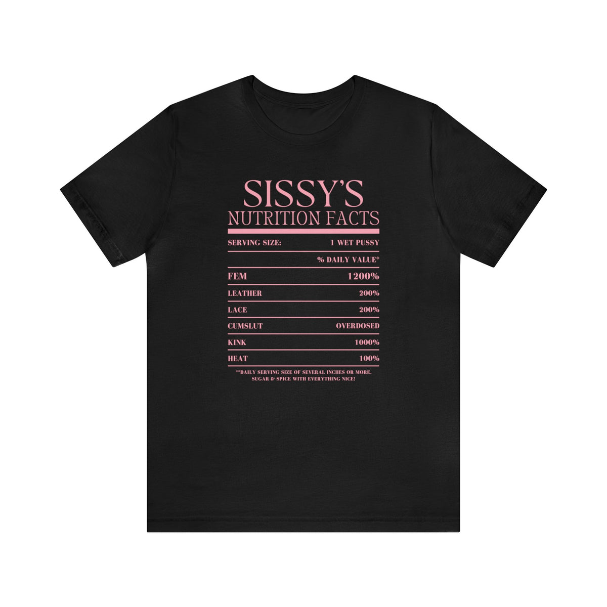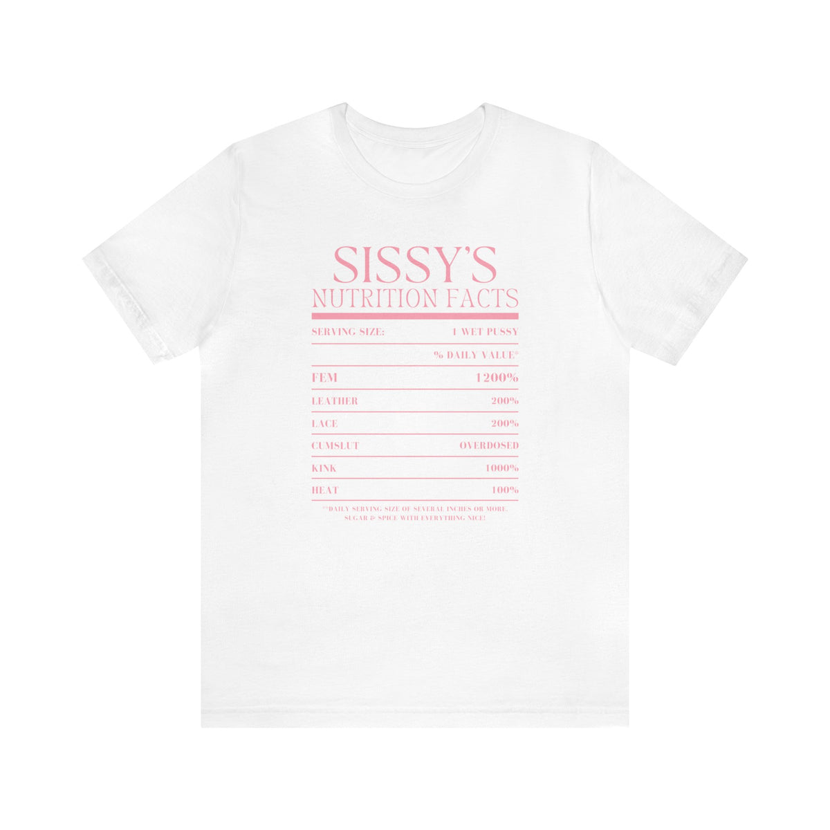 Show it off with our Sissy's Nutrition Facts Tee, a daring addition to any wardrobe that doesn't shy away from risqué fun. This provocative tee is printed on the exceptionally soft and comfortable Bella + Canvas 3001 unisex tee. Known for its premium craftsmanship and universally flattering fit, the Bella + Canvas 3001 is a favorite for its lightweight and airy feel, making it an excellent canvas for the bold graphic that playfully quantifies a Sissy's traits. The shirt's design is a vibrant pink that pops against the tee's fabric, offering an eye-catching contrast that's both striking and stylish. This tee is not just a piece of clothing; it's a statement piece that celebrates individuality and humor. It's versatile enough for everyday wear while also serving as the perfect ice-breaker at social gatherings.