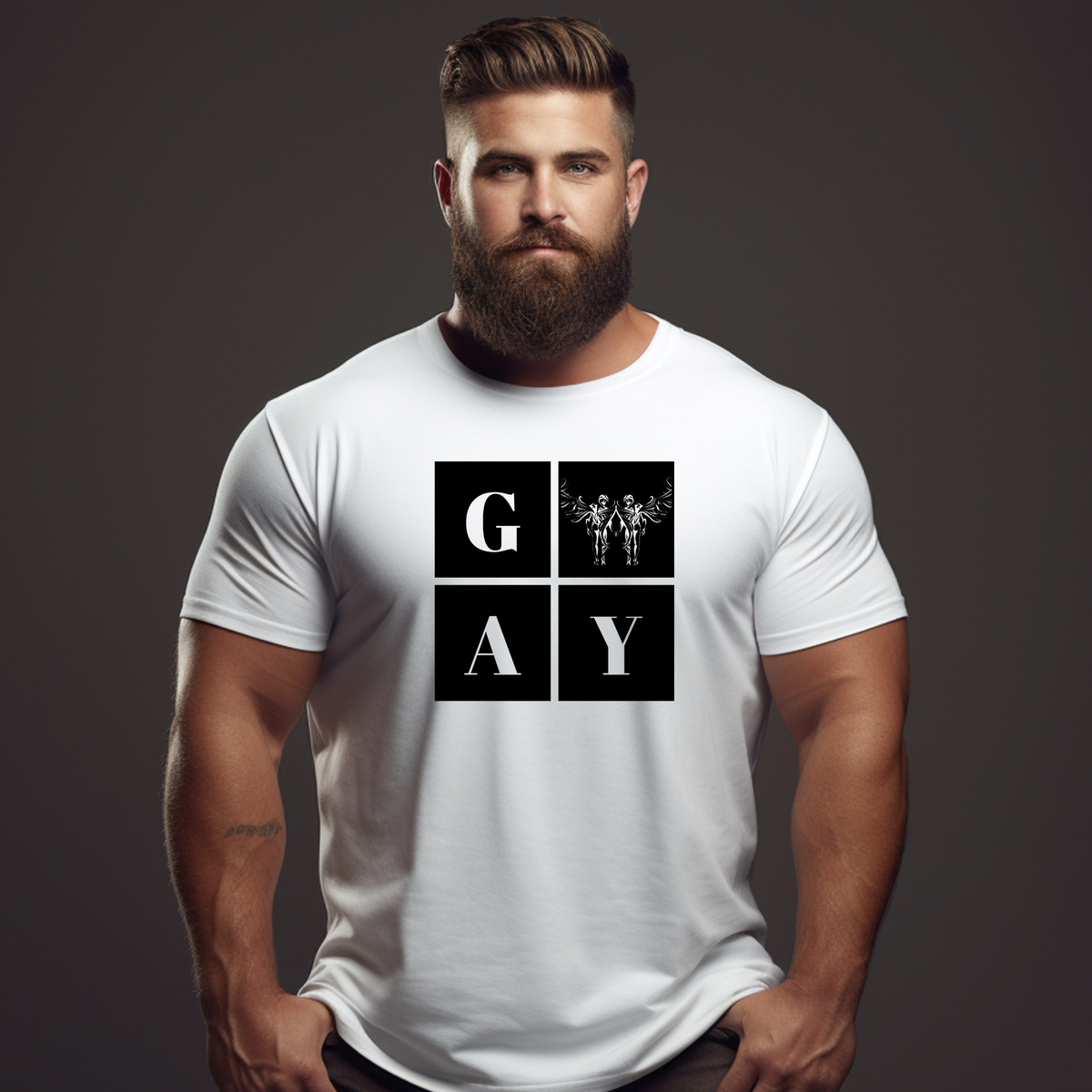 A variation of our popular ‘Angels in Love’ design. Step into a divine dimension of love with our 'Gay Angels' tee. Two male angels walk hand in hand into eternity surrounded by the letterblocks G A Y. A beautiful portrayal of celestial love, this tee is a heavenly declaration that love transcends all barriers, all judgments, all realms. Join the journey, hand in hand, heart to heart, angel to angel.