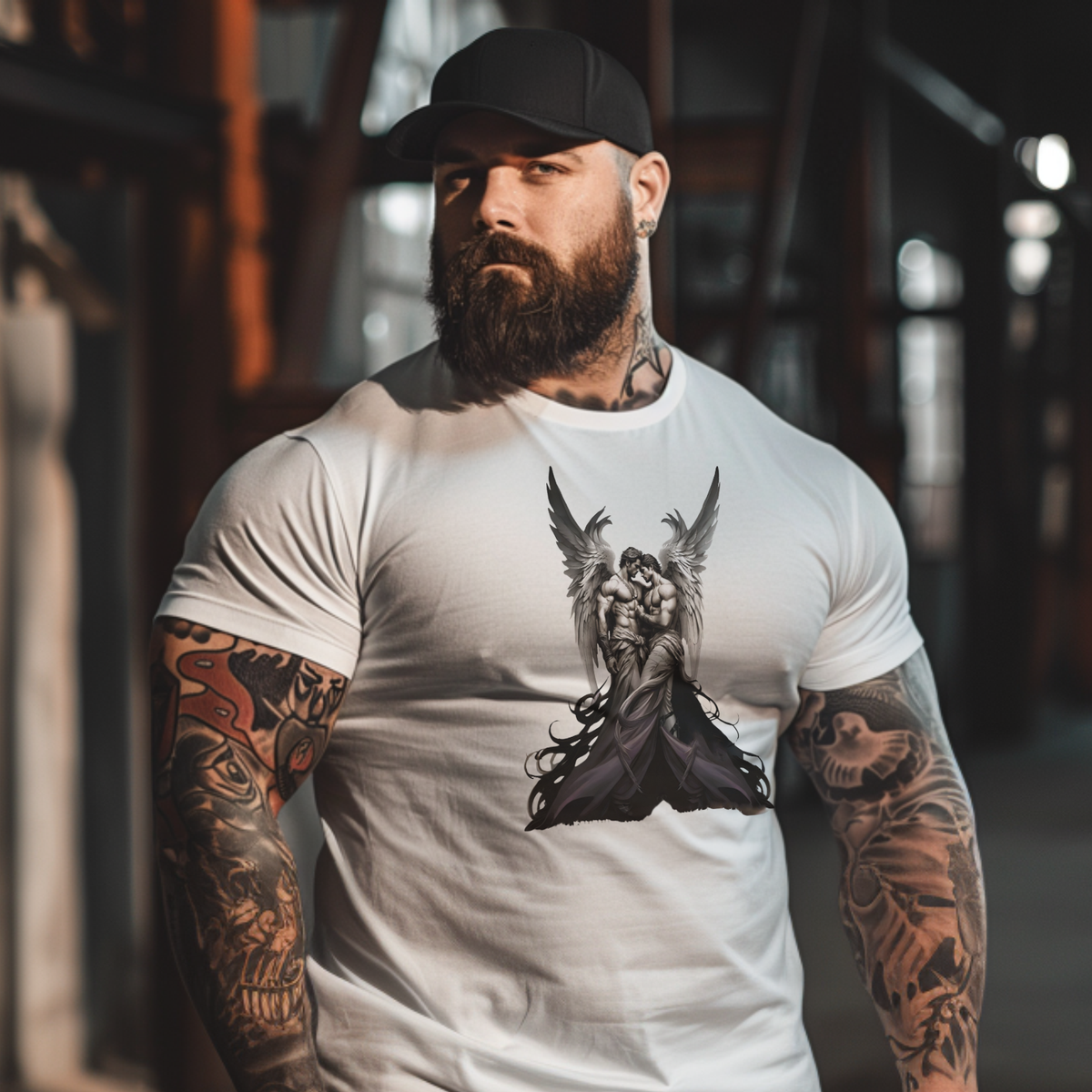 Our Raptured Angels Tee is a striking piece of wearable art, showcasing an ethereal design that captures the beauty only two men can express. Printed on the superior Bella+Canvas 3001 tee, this shirt features a powerful image of two male angels in a close embrace, their wings enveloping them in a display of divine protection and intimacy. The artwork is rendered in a monochrome palette, emphasizing the intricate details of their muscular forms, the soft feathers of their wings, and the flow of their garments.