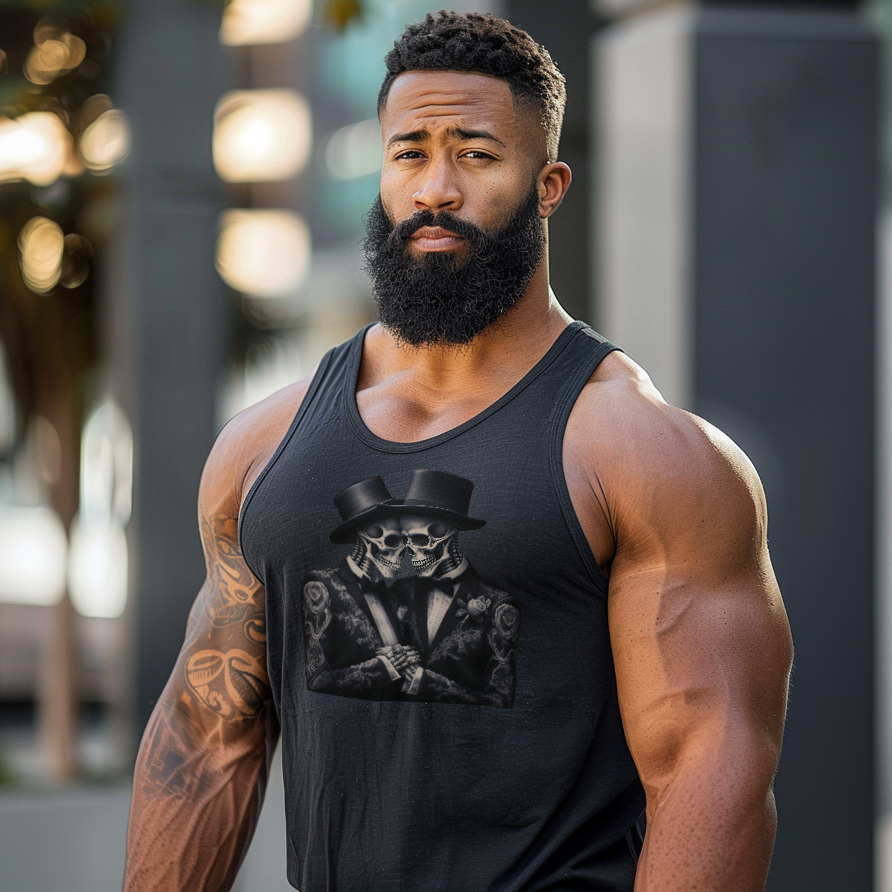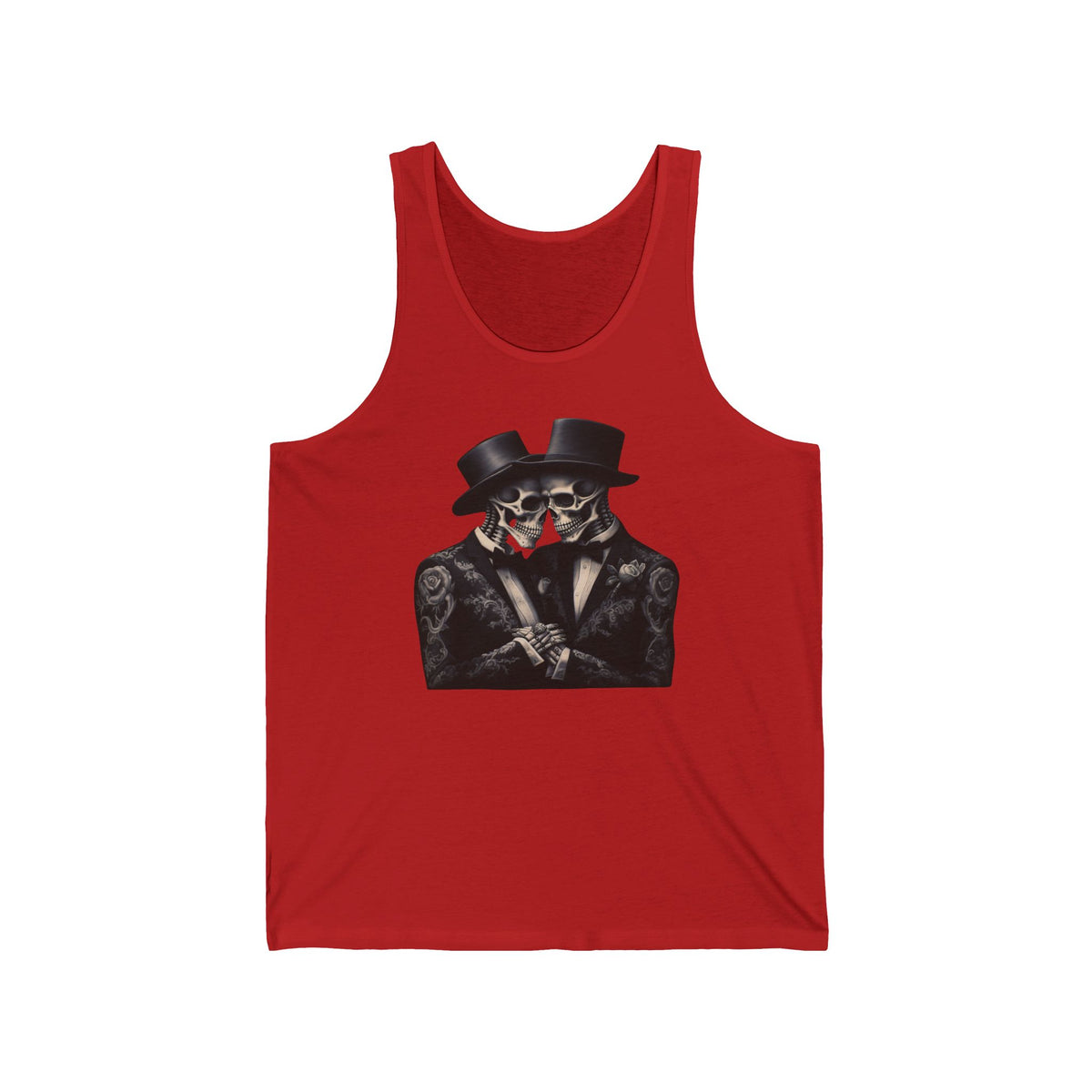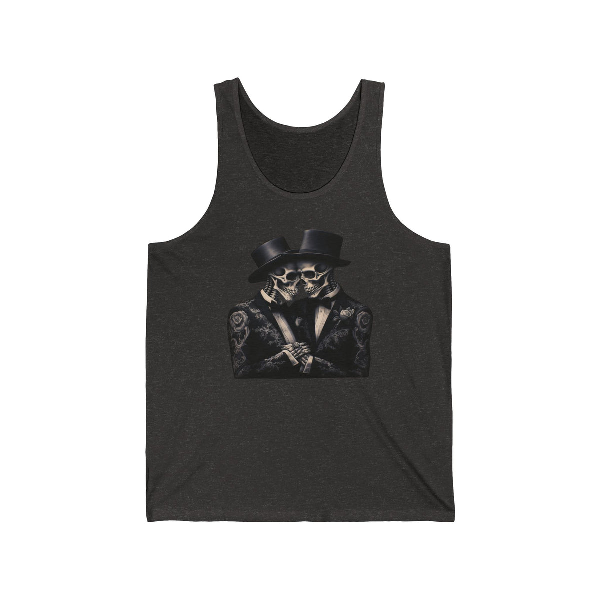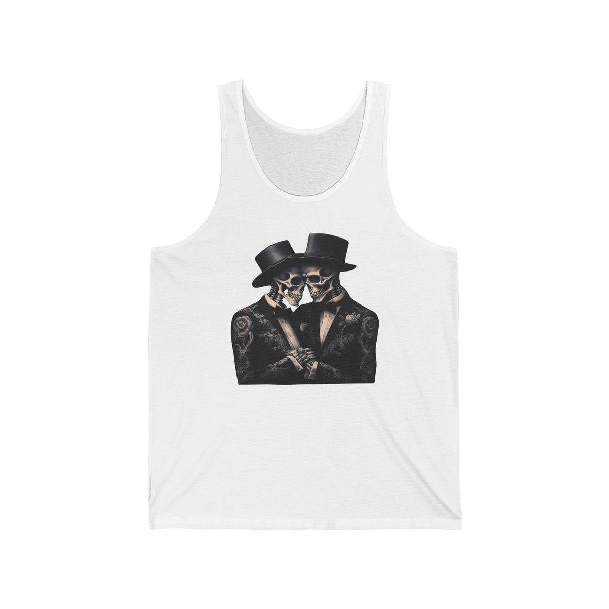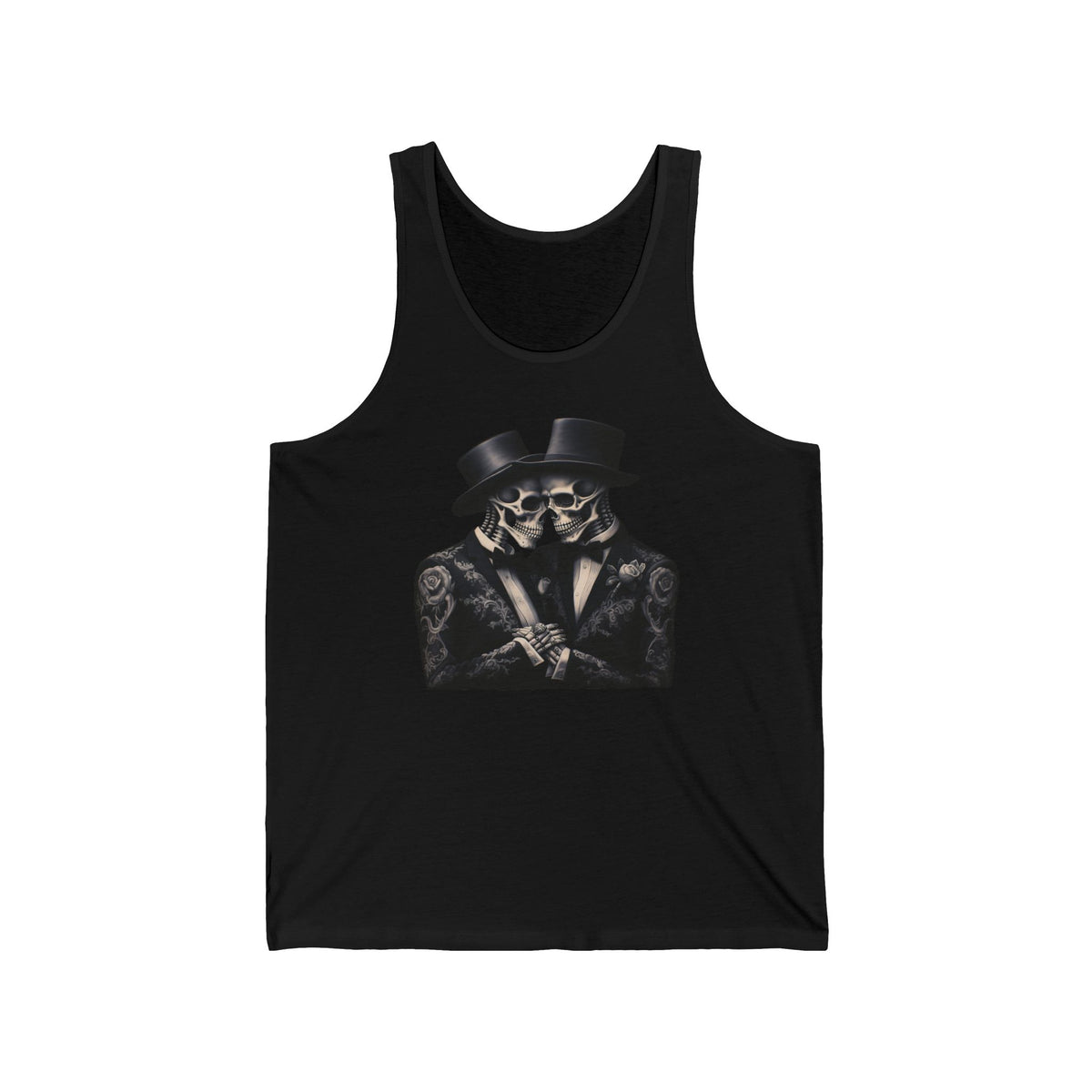 Celebrate eternal love with our Skeleton Grooms Tank, a design that beautifully captures the union of two souls that transcend life and death. Featuring two dapper male skeletons in elegant attire, this tank is perfect for expressing your unique style during Halloween or Valentine’s Day. The detailed illustration embodies the beauty of a bond that is unbreakable, even in the afterlife. It's not just a tank—it's a statement for those who embrace love in all its forms.