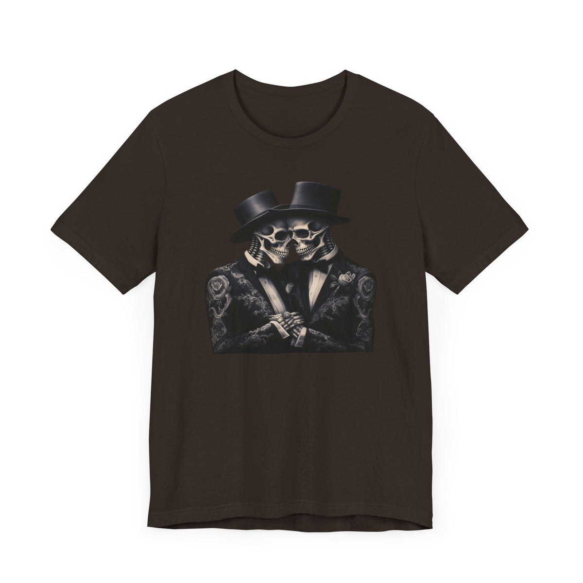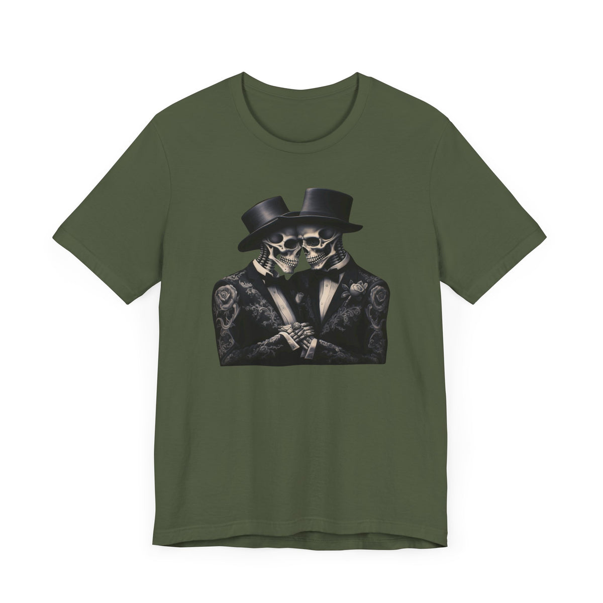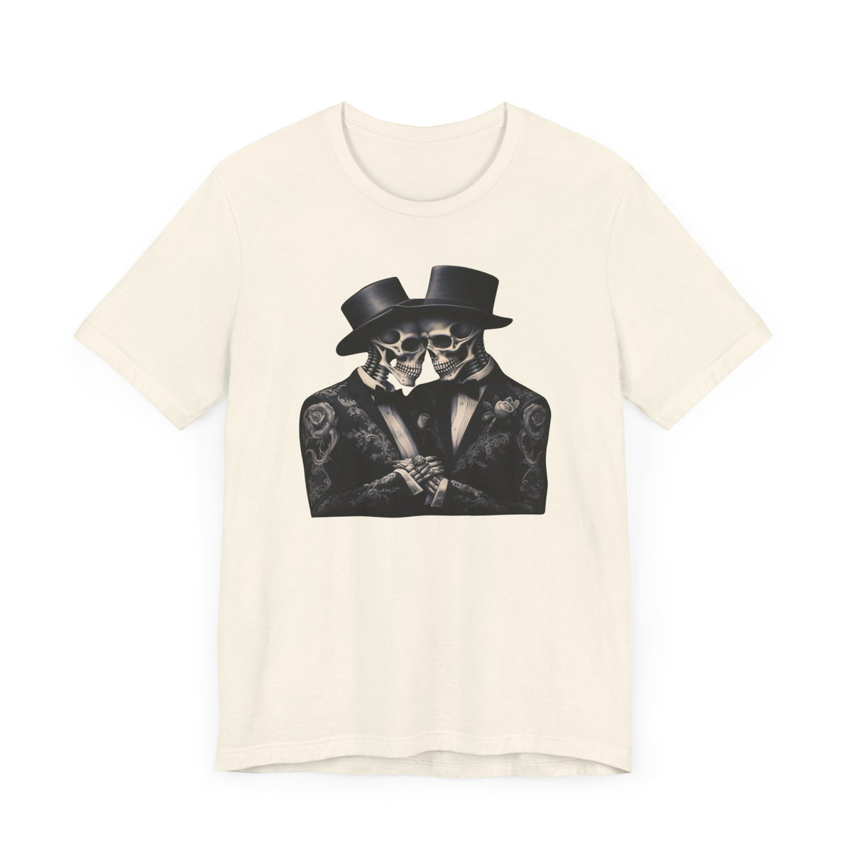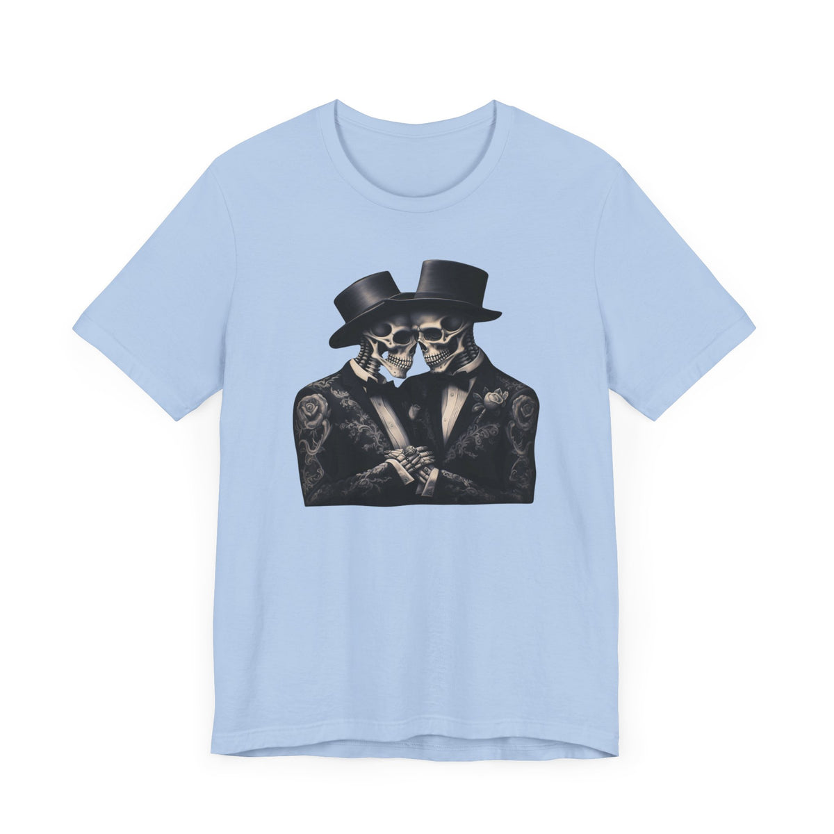 Celebrate eternal love with our Skeleton Grooms Te, a design that beautifully captures the union of two souls that transcend life and death. Featuring two dapper male skeletons in elegant attire, this tank is perfect for expressing your unique style during Halloween or Valentine’s Day. The detailed illustration embodies the beauty of a bond that is unbreakable, even in the afterlife. It's not just a tee—it's a statement for those who embrace love in all its forms.