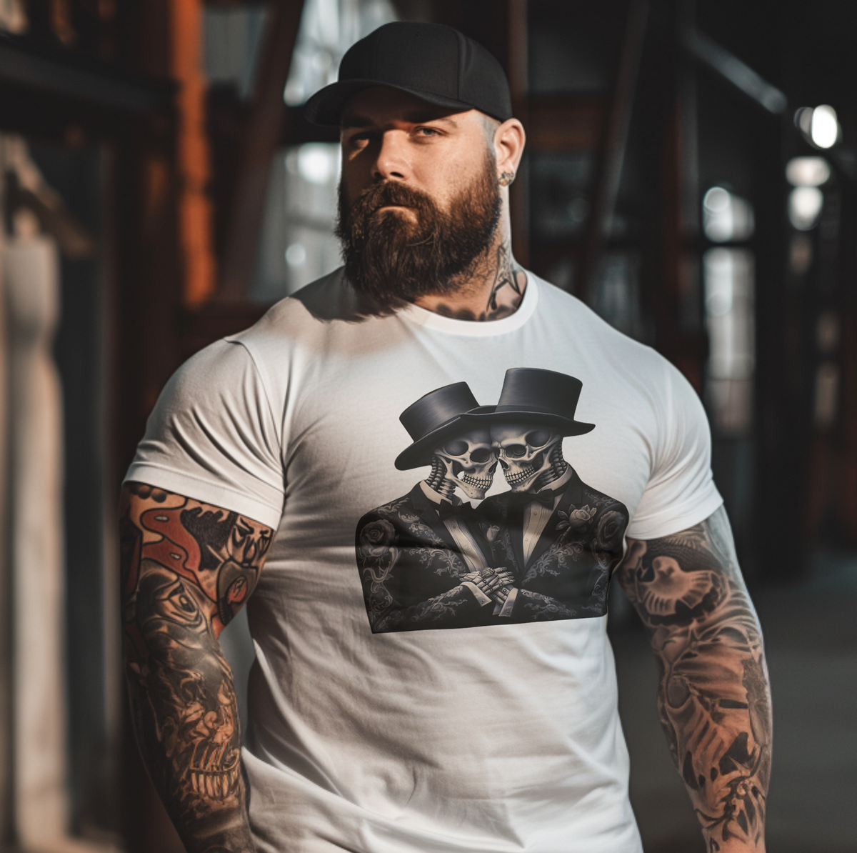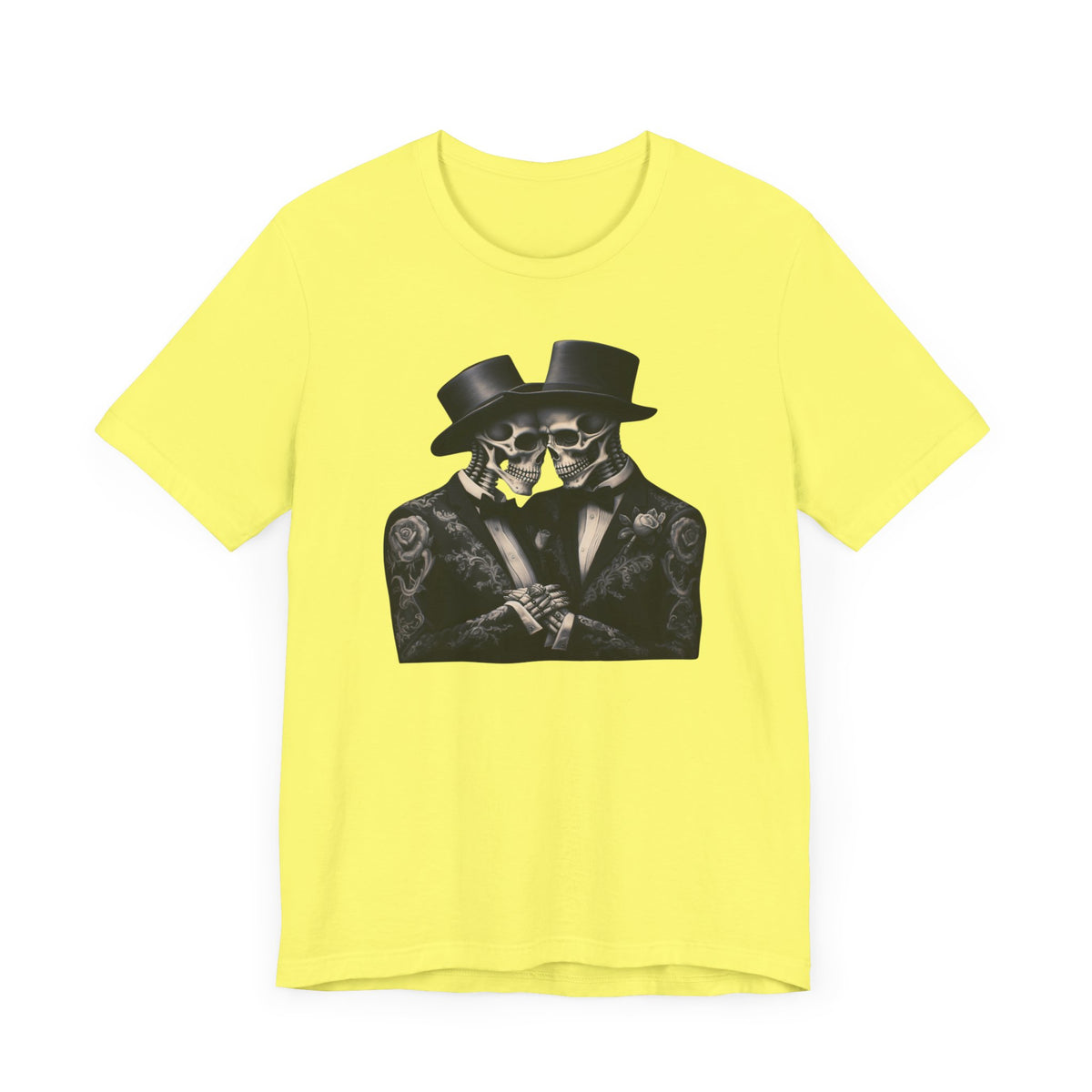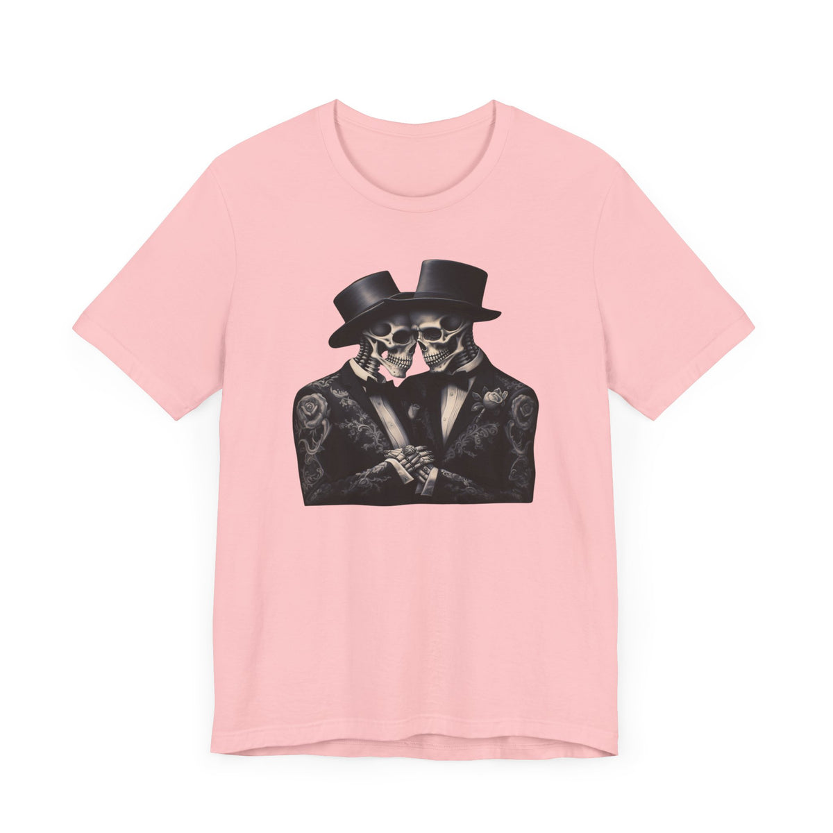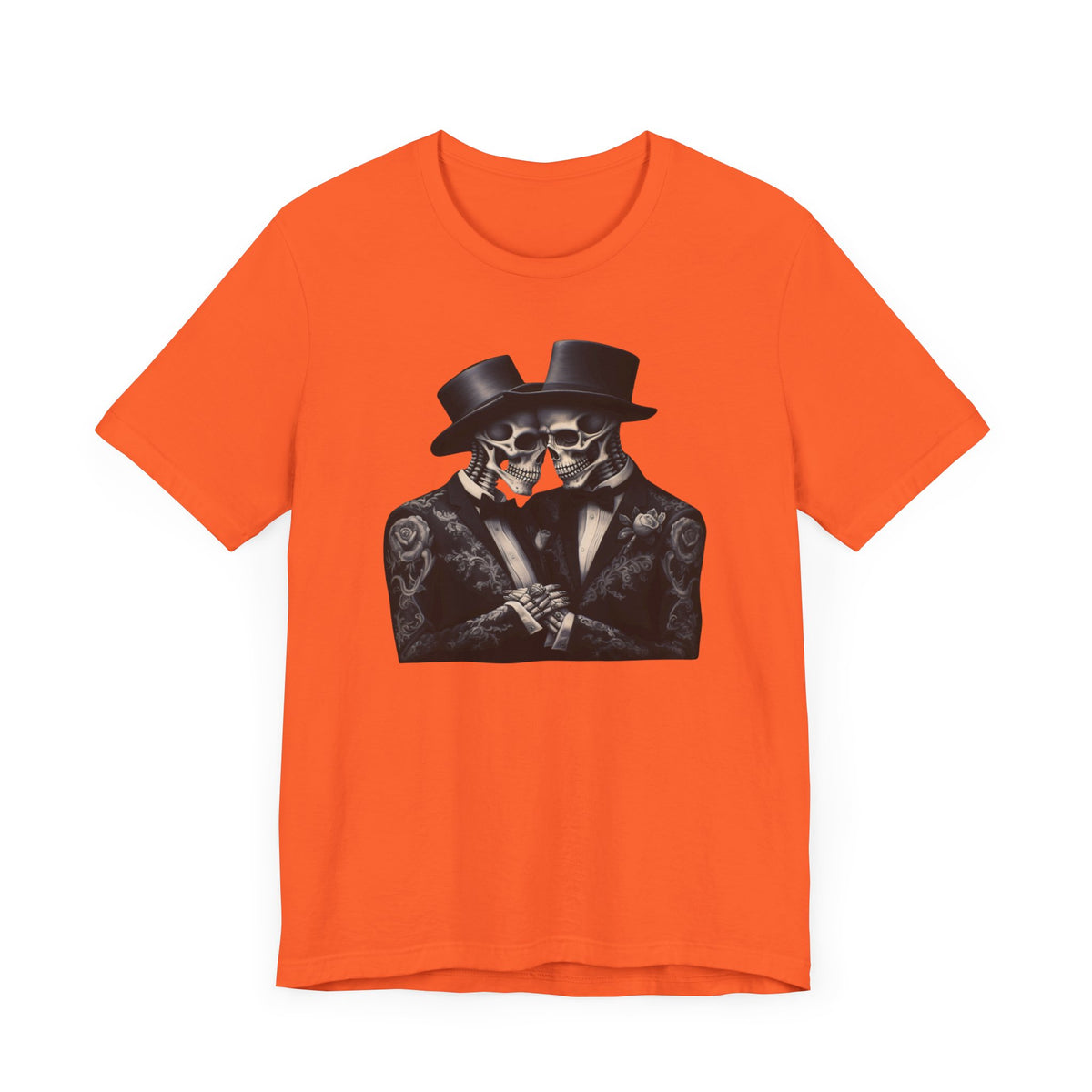 Celebrate eternal love with our Skeleton Grooms Te, a design that beautifully captures the union of two souls that transcend life and death. Featuring two dapper male skeletons in elegant attire, this tank is perfect for expressing your unique style during Halloween or Valentine’s Day. The detailed illustration embodies the beauty of a bond that is unbreakable, even in the afterlife. It's not just a tee—it's a statement for those who embrace love in all its forms.