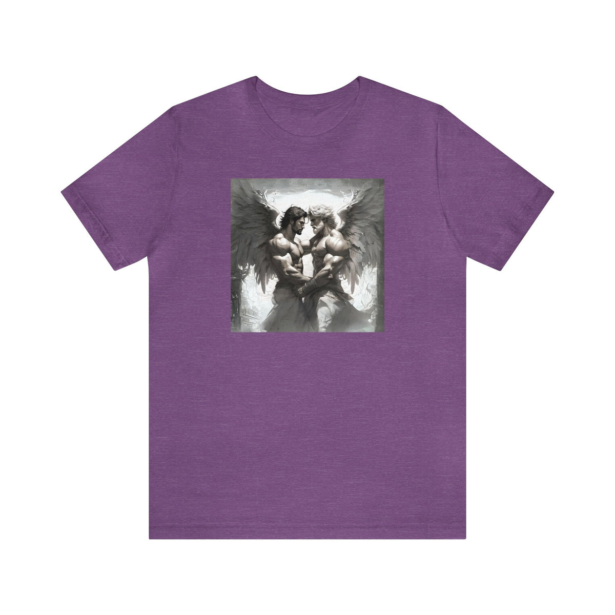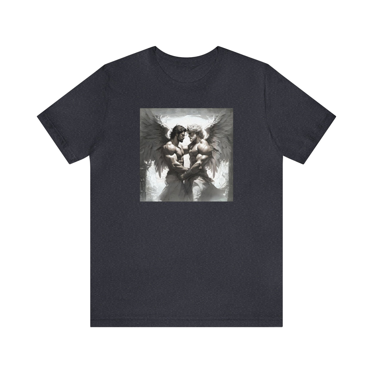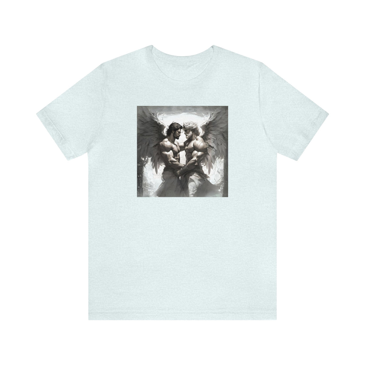 Our Valentine Angels Tee: Daddy-Boy edition is a captivating piece of apparel that transcends traditional fashion. Printed on the Bella+Canvas 3001, known for its premium comfort and outstanding durability, this T-shirt showcases an awe-inspiring design featuring two muscular angels in a poignant, face-to-face encounter. Their expansive wings and powerful stances evoke a narrative of strength, guardianship, and a profound connection. This high-quality print mirrors the depth of the bonds it represents, rendered in a monochromatic palette that highlights every intricate detail, from the feathers of their wings to the expressions of solemn intimacy on their faces.