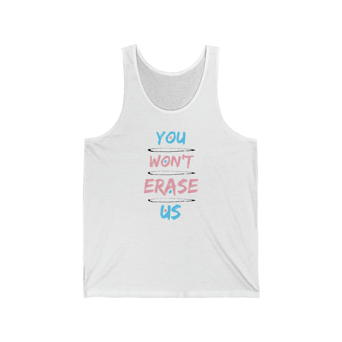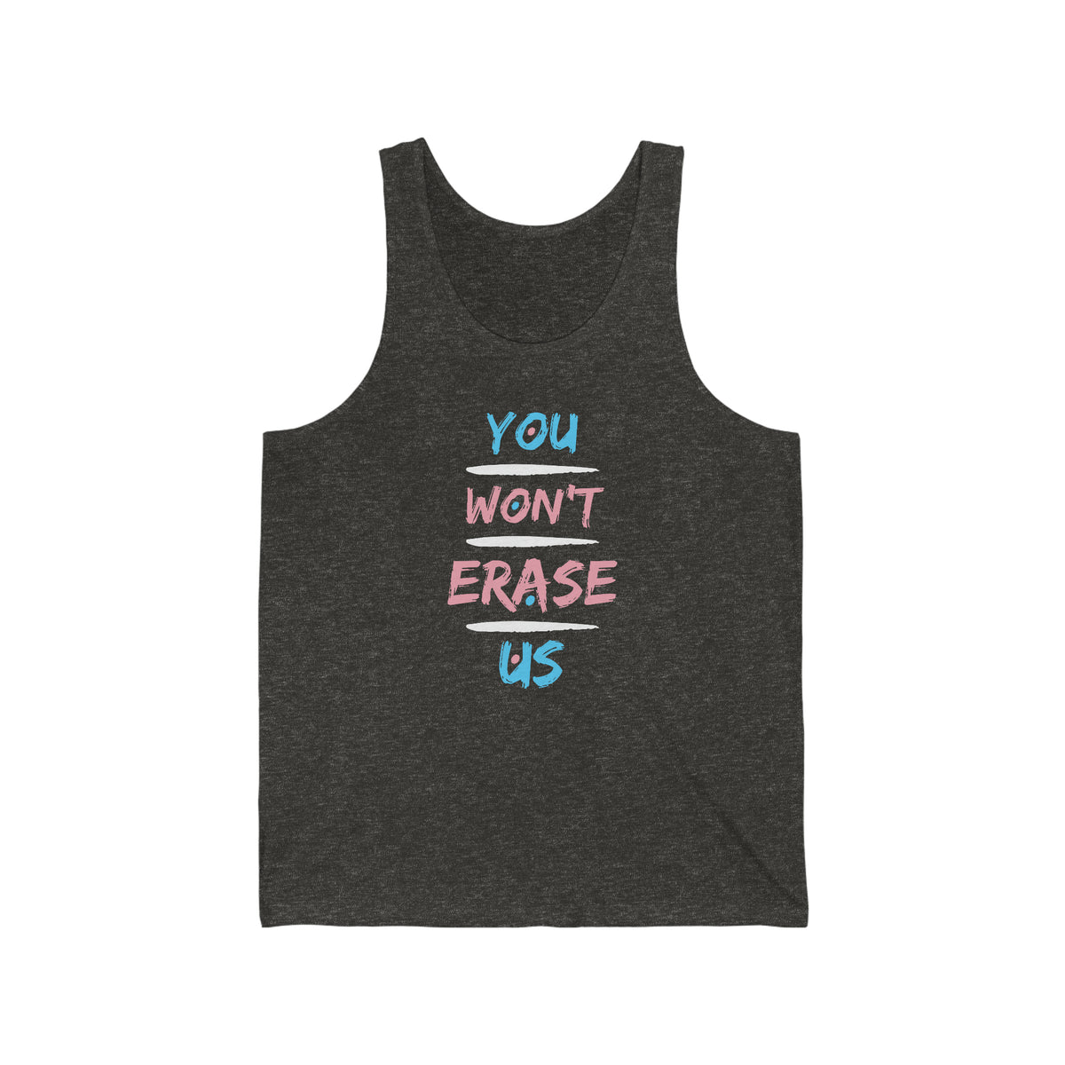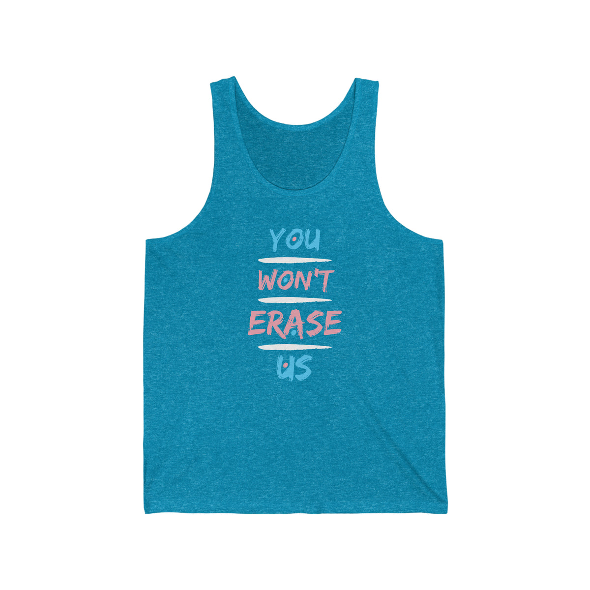Embrace your resilience with our 'You Won't Erase Us' tank, now resonating in the empowering hues of trans pride. This is a resounding affirmation of existence, a clarion call against those attempting to silence us. It's not merely an act of defiance, but a celebration of our identity's vibrant spectrum, our truth's solidity, and the thunderous power of our voices. Stand unyielding, stand proud, because we're not fading away, and silence is simply not in our nature.