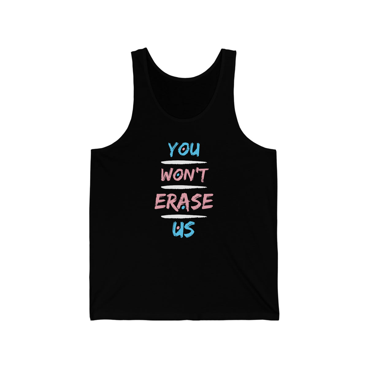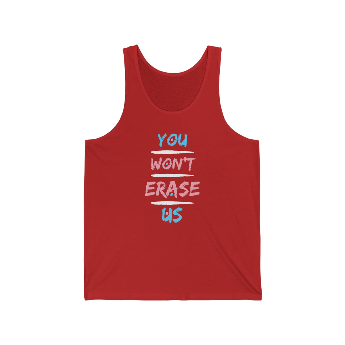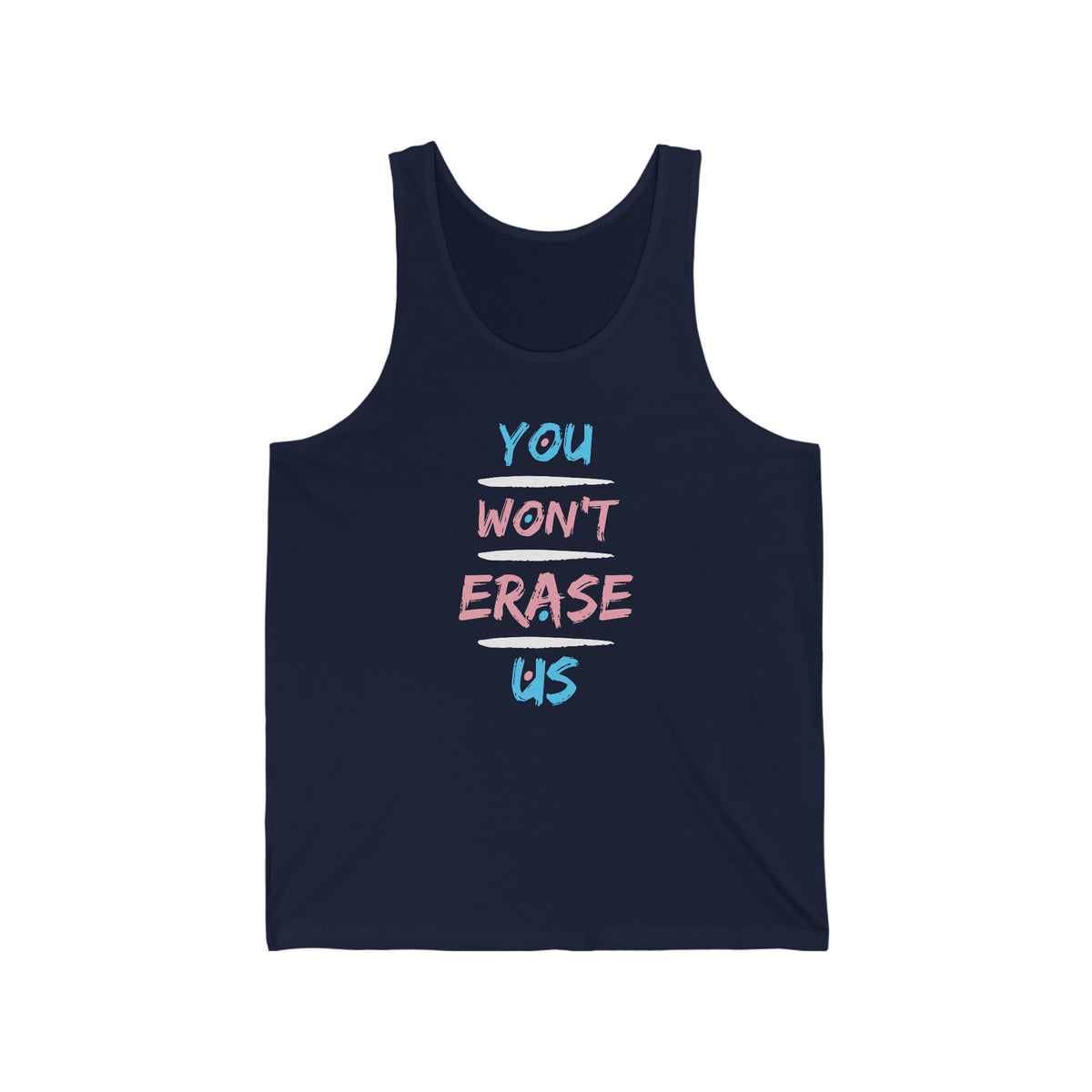 Embrace your resilience with our 'You Won't Erase Us' tank, now resonating in the empowering hues of trans pride. This is a resounding affirmation of existence, a clarion call against those attempting to silence us. It's not merely an act of defiance, but a celebration of our identity's vibrant spectrum, our truth's solidity, and the thunderous power of our voices. Stand unyielding, stand proud, because we're not fading away, and silence is simply not in our nature.