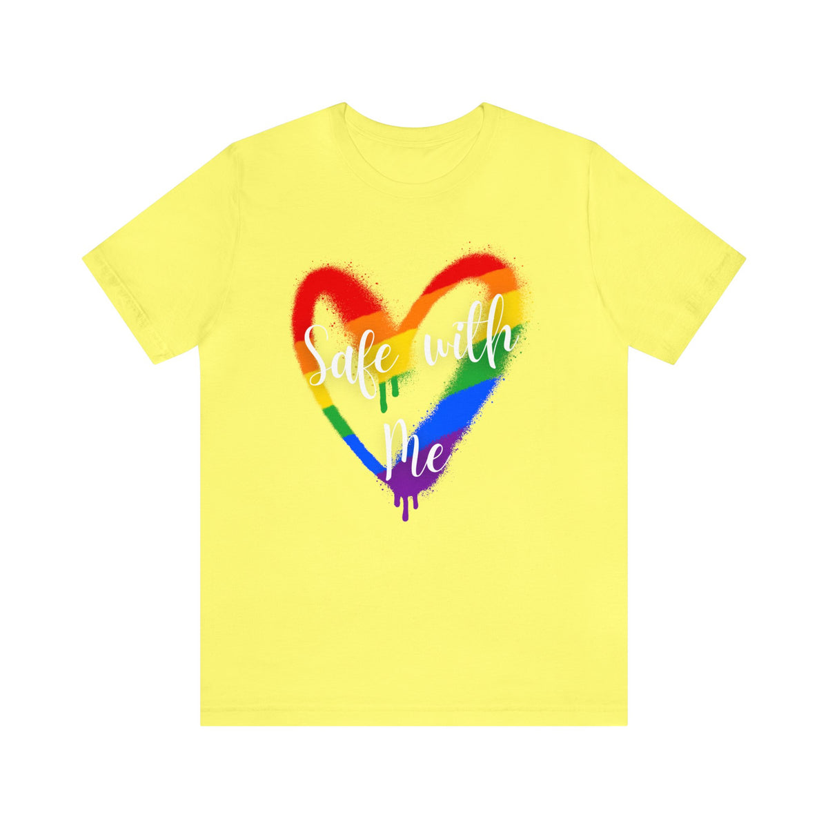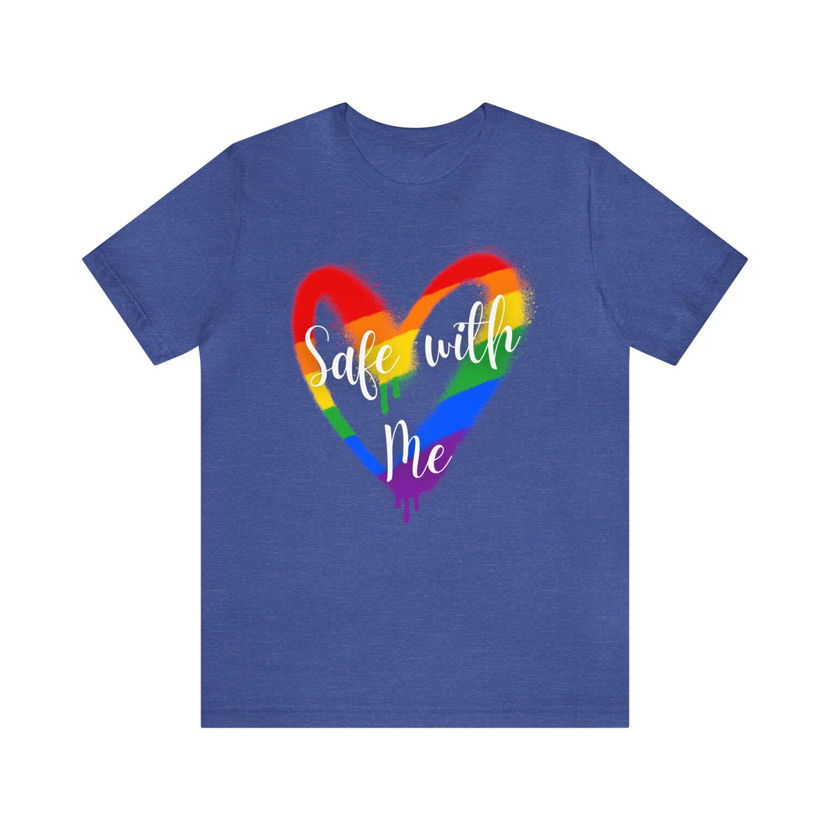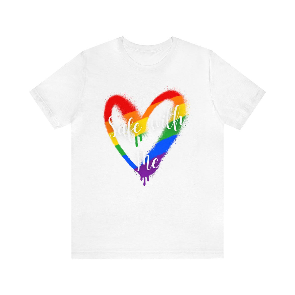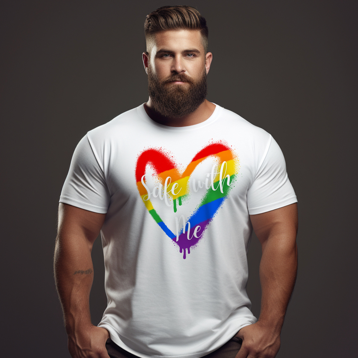 Offer a beacon of acceptance with our 'Safe With Me' tee. The swooping Pride Heart isn't just a symbol; it's a promise. When you wear this shirt, you're not just expressing yourself, you're offering a haven for others, too. Because here, beneath the vibrant spread of the Pride Heart, everyone is welcome, and everyone is safe. Stand with us, because love protects.