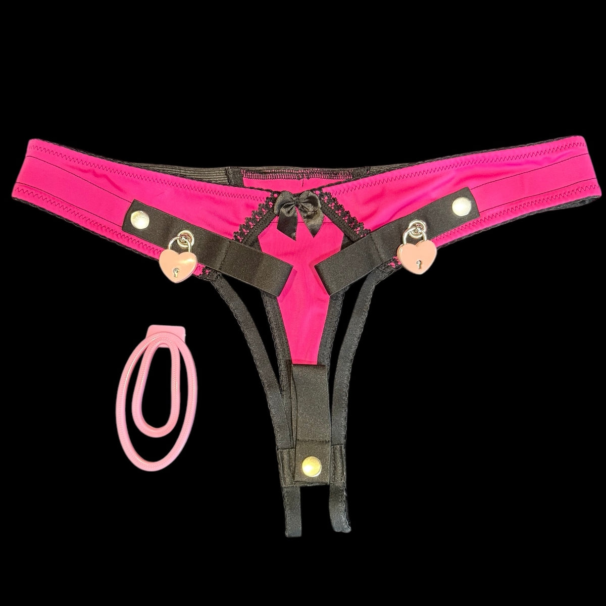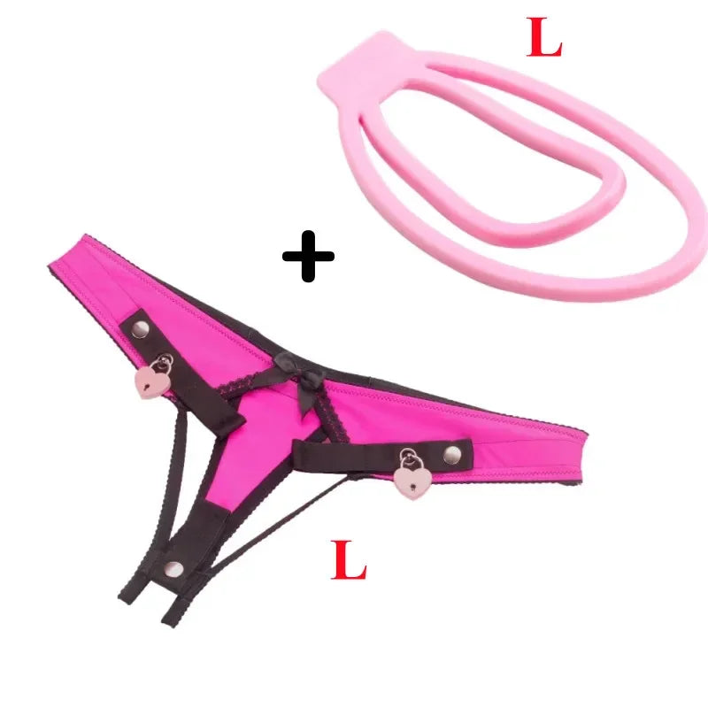 Embrace the sissy within with our new lycra FUFU Clip Chastity Belt, crafted to deliver both style and comfort. Each belt includes a sleek pink ABS plastic FUFU clip. These lycra underwear comes in two colors and two versions—one adorned with a heart lock for a flirty twist, and another without, for a more understated approach.