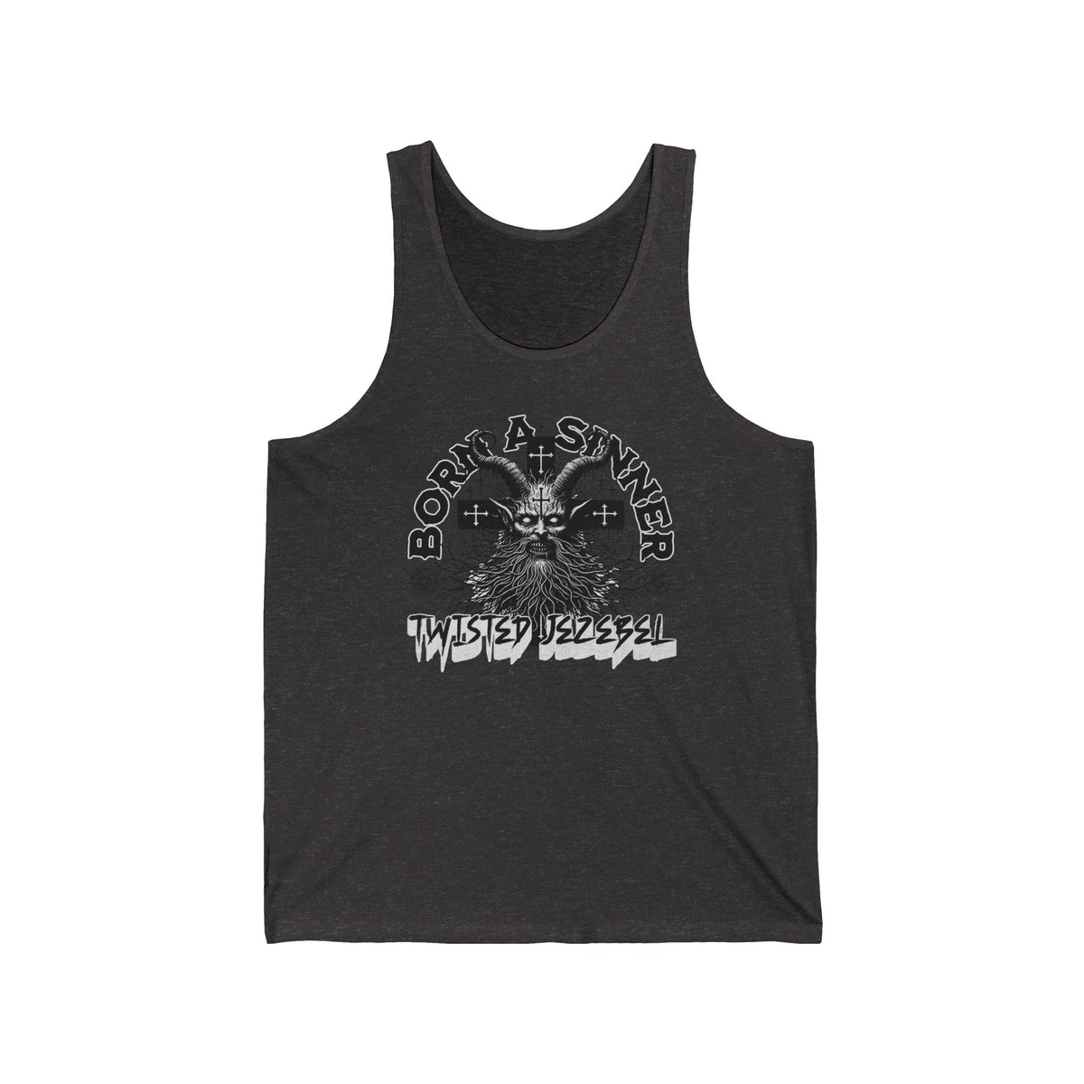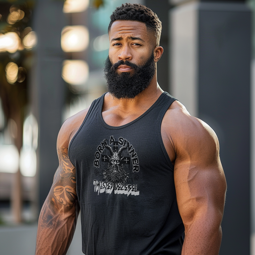 Embrace your inner rebel with our Born A Sinner Tank. Featuring the demon Asmodeus, the symbol of lust and desire, paired with the powerful imagery of inverted crosses, this design speaks to the darkness we all carry. With bold, twisted lettering declaring your allegiance, this tank is for those who are unapologetically themselves, challenging norms with every step. It’s not just a Halloween piece—it’s a declaration for the fearless, those unafraid to flaunt their “sinner” status.