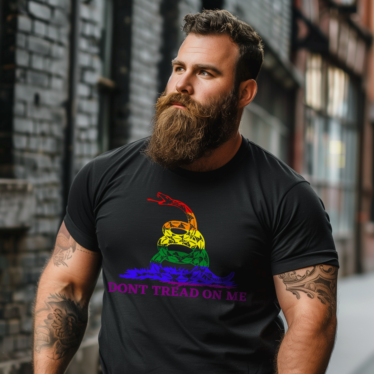 Turn the tables on tradition with our 'Don't Tread On Me' tee – a fierce, pride-colored revamp of the Gadsden flag. It's not just a fashion statement, it's a declaration of resilience and resistance. Wear your defiance!